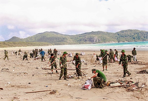 Cán bộ, chiến sĩ Ban CHQS huyện Côn Đảo thu gom rác trên bãi biển.