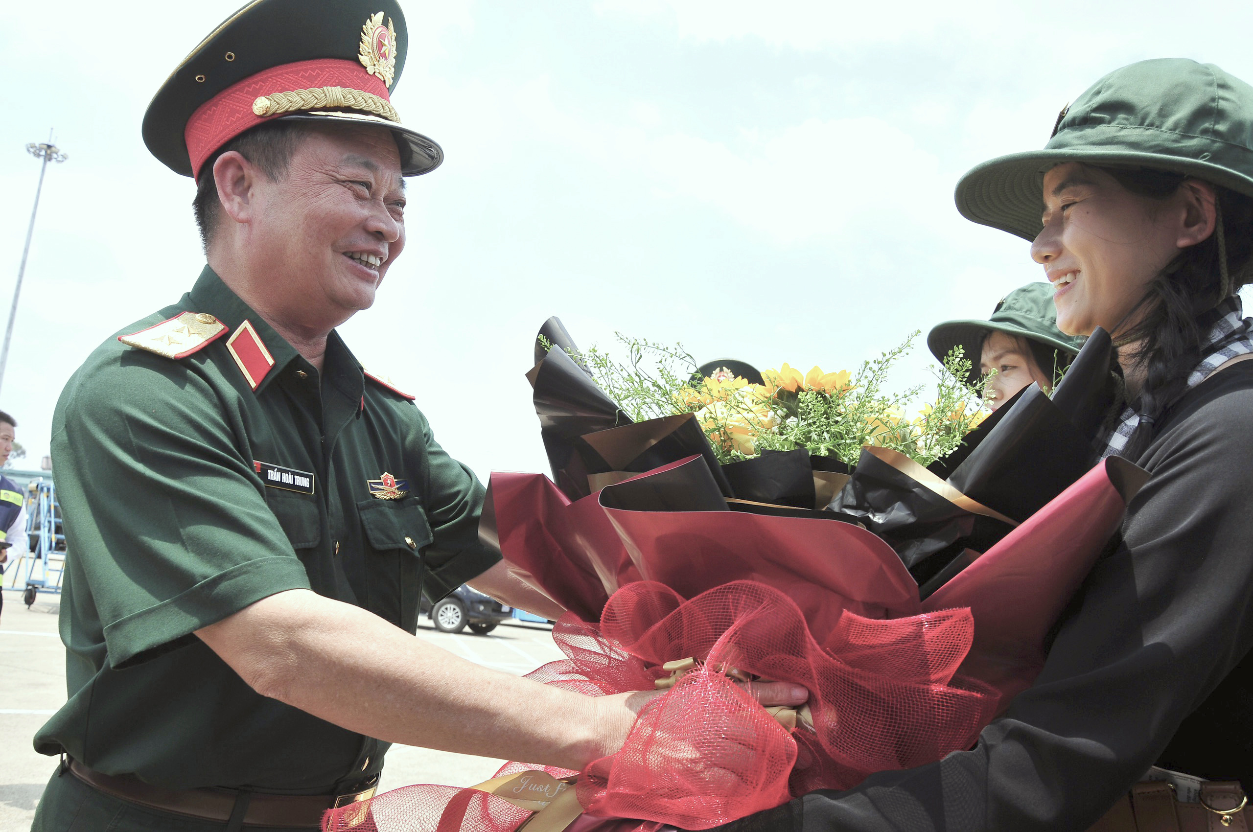 Trung tướng Trần Hoài Trung, Bí thư Đảng ủy, Chính ủy Quân khu tặng hoa chúc mừng Khối nữ du kích miền Nam tại buổi xuất quân tham gia huấn luyện diễu binh kỷ niệm 70 năm Chiến thắng Điện Biên Phủ (Ảnh: Nguyễn Hoàng).