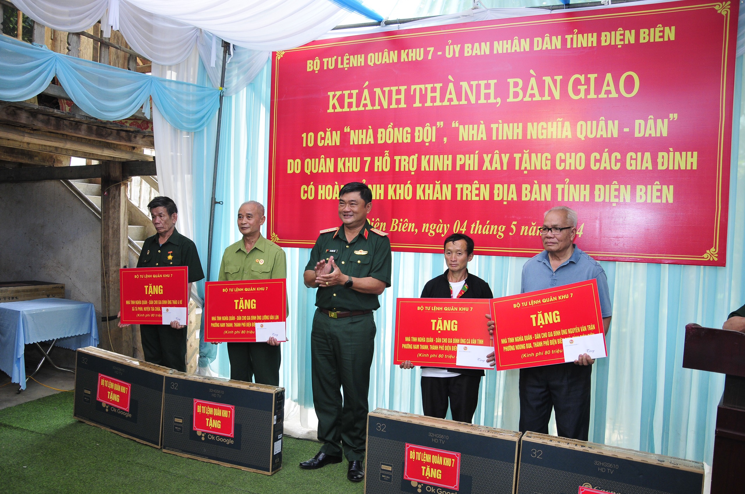 Thiếu tướng Lê Xuân Thế, Phó Tư lệnh Quân khu 7 trao bảng tượng trưng tặng Nhà tình nghĩa Quân – Dân trên địa bàn tỉnh Điện Biên (Ảnh: Hữu Tân).