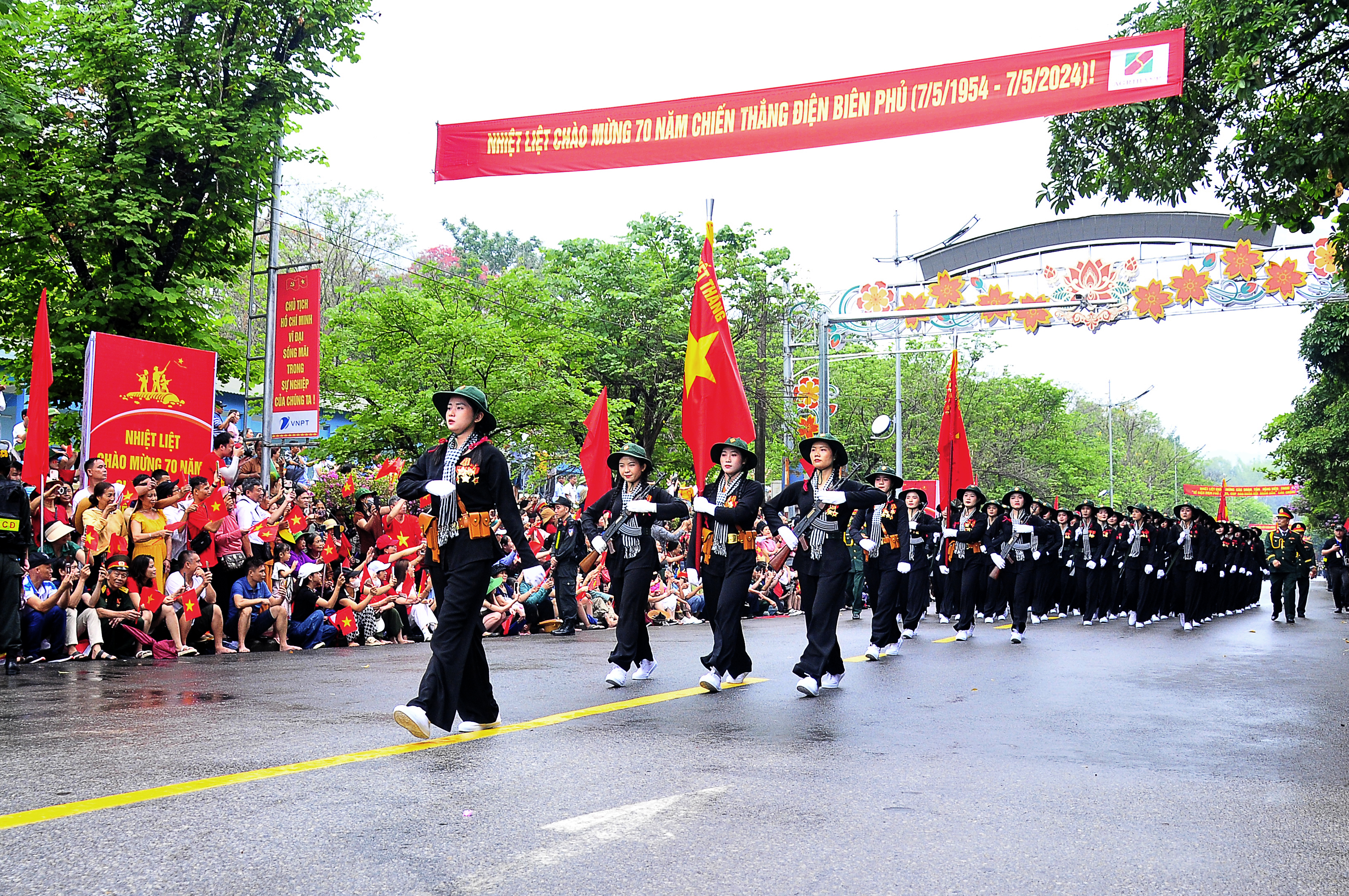 Trên mảnh đất lịch sử Điện Biên, 92 cô gái đại diện khối “Nữ du kích miền Nam” nổi bật với sự dịu dàng, đằm thắm trong bộ quần áo bà ba đen, cổ đeo khăn rằn, đội nón tai bèo, tay bồng súng, cùng các lực lượng tham gia diễu binh, diễu hành, tái hiện khí thế hào hùng của Chiến thắng Điện Biên Phủ; thể hiện khí phách, sức mạnh của khối đại đoàn kết toàn dân tộc; truyền thống yêu nước, ý chí tự lực, tự cường; sự lớn mạnh và trưởng thành của LLVT cách mạng miền Nam trong những ngày Tháng Năm lịch sử. Hoàn thành xuất sắc nhiệm vụ dịp kỷ niệm 70 năm Chiến thắng Điện Biên Phủ, đồng chí Nguyễn Lê Tuyết Nhi, Khối nữ Du kích miền Nam bộc bạch: “Khi đi diễu hành qua các con đường ở thành phố Điện Biên, rất nhiều người dân đã chào đón, cổ vũ chúng tôi, điều đó làm cho chúng tôi cảm thấy vô cùng xúc động và tự hào, hình ảnh về người phụ nữ Việt Nam nói chung và nữ du kích miền Nam nói riêng được lan tỏa, sáng đẹp hơn trong mắt của Nhân dân. Đây là kỷ niệm đẹp không thể phai mờ trong tâm trí của mỗi chị em chúng tôi”.