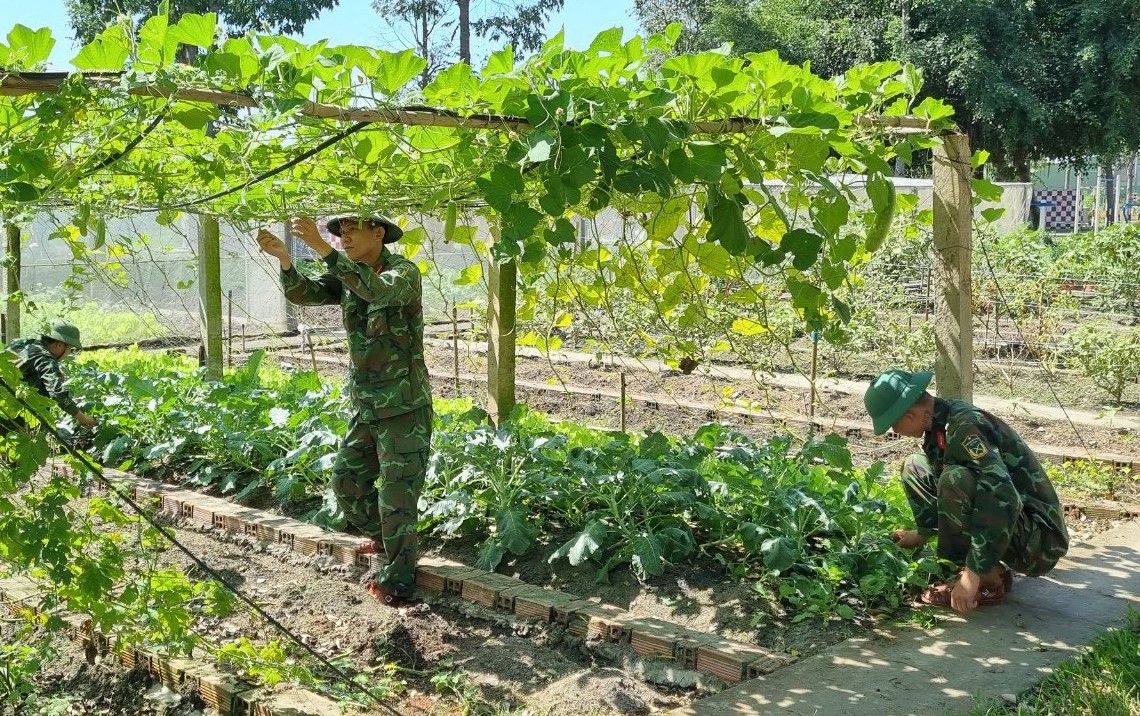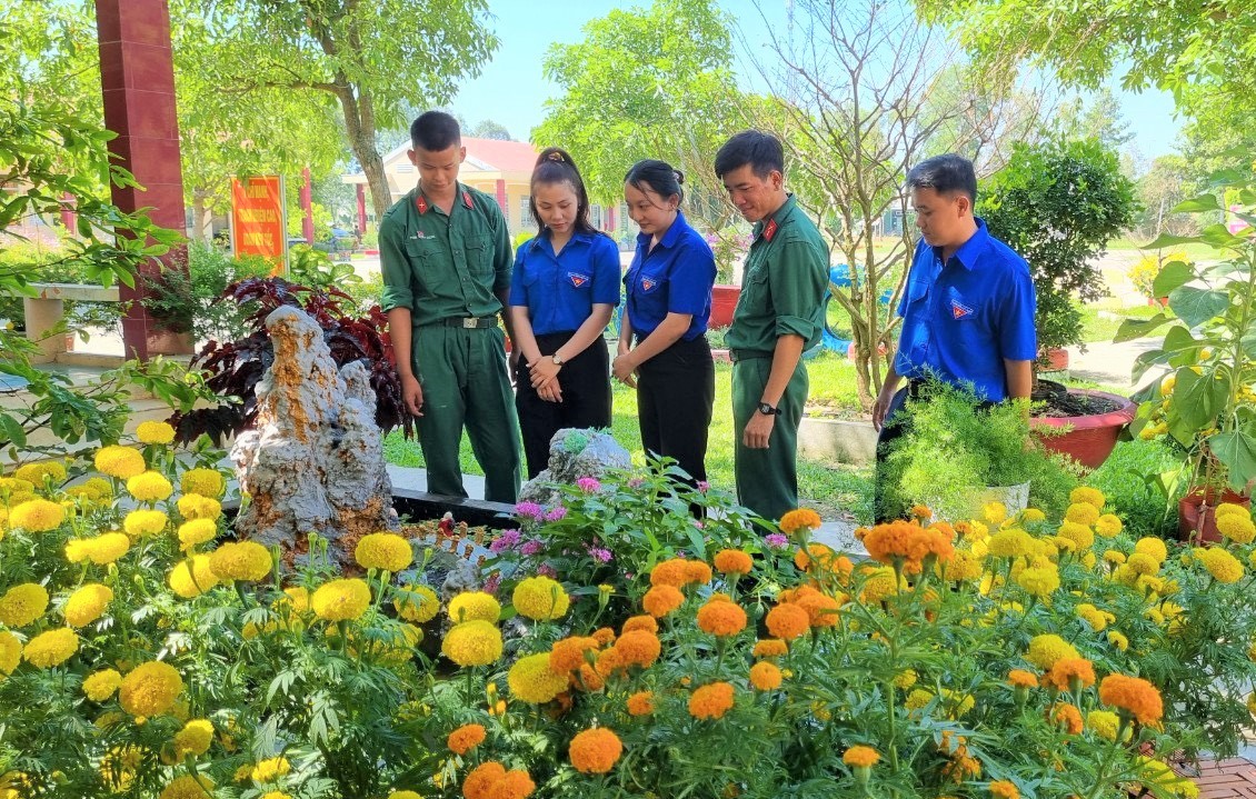Chiến sĩ Đại đội bộ binh thị xã Kiến Tường và đoàn viên, thanh niên đơn vị kết nghĩa chăm sóc cảnh quan đơn vị.