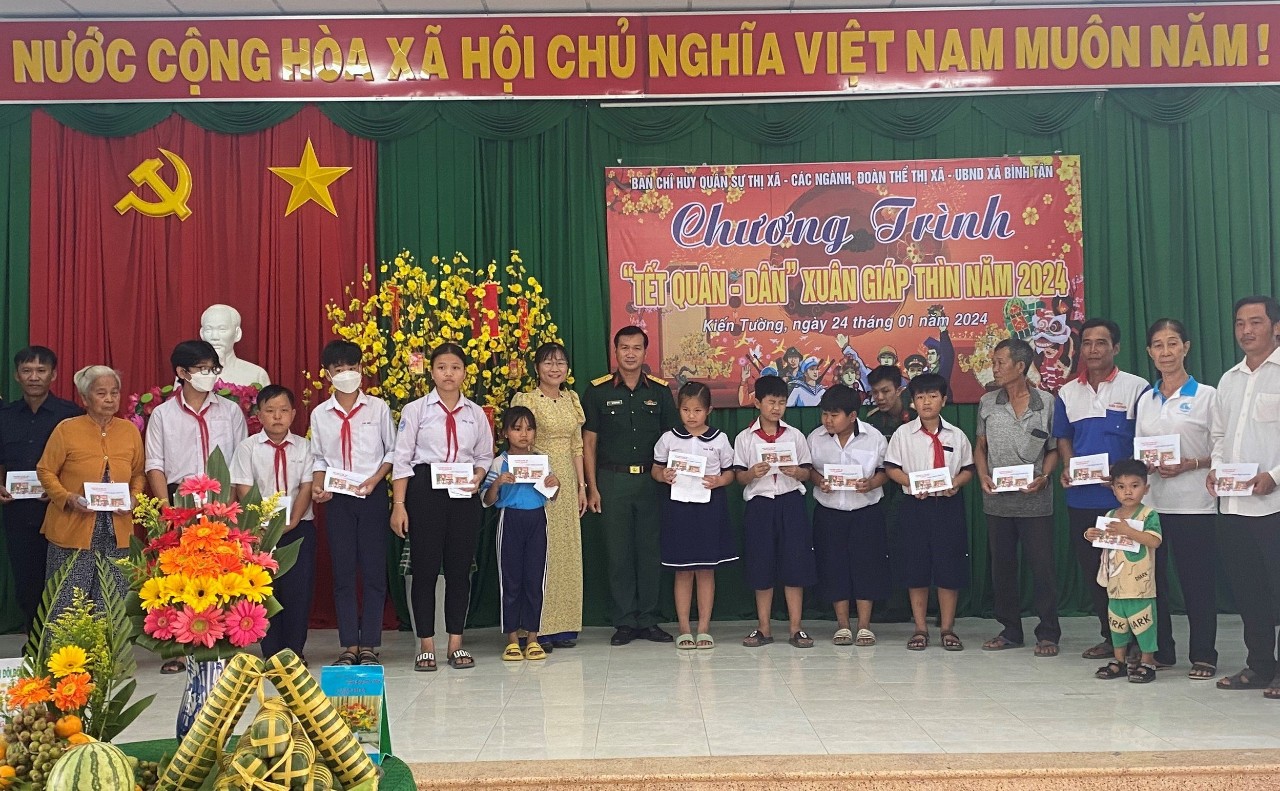 Ban CHQS thị xã Kiến Tường tặng quà Tết cho các hộ gia đình và học sinh có hoàn cảnh khó khăn.