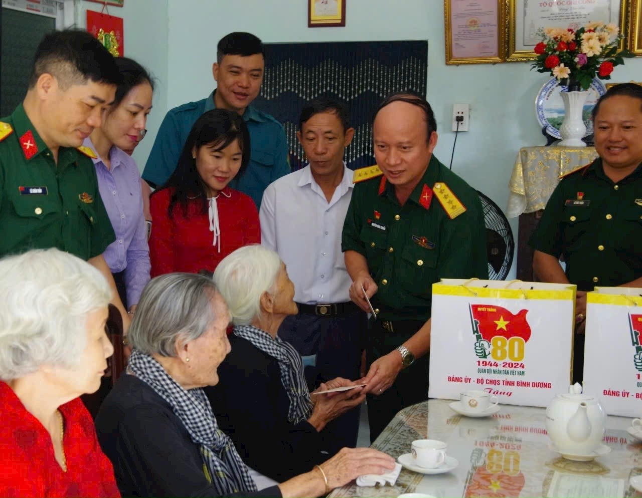 Đại tá Nguyễn Đình Chuẩn, Chính ủy Bộ CHQS tỉnh tặng quà Mẹ Việt Nam anh hùng huyện Dầu Tiếng.