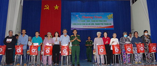 Nằm trong chuỗi hoạt động vui xuân, đón tết Nguyên đán Quý Mão 2023, chương trình “Tết quân - dân” được tổ chức hết sức ý nghĩa. Theo đó, Bộ CHQS tỉnh phối hợp với Hội Chữ thập đỏ tỉnh và Viettel Bình Dương tổ chức chương trình “Tết quân - dân” tại xã An Sơn (TP.Thuận An). Chương trình gồm các hoạt động như giao lưu văn nghệ; tổ chức giải bóng đá tứ hùng; thăm, tặng quà mẹ Việt Nam anh hùng và đặc biệt là dành tặng 100 phần quà nhu yếu phẩm thiết yếu cho các đối tượng chính sách, người nghèo trên địa bàn.