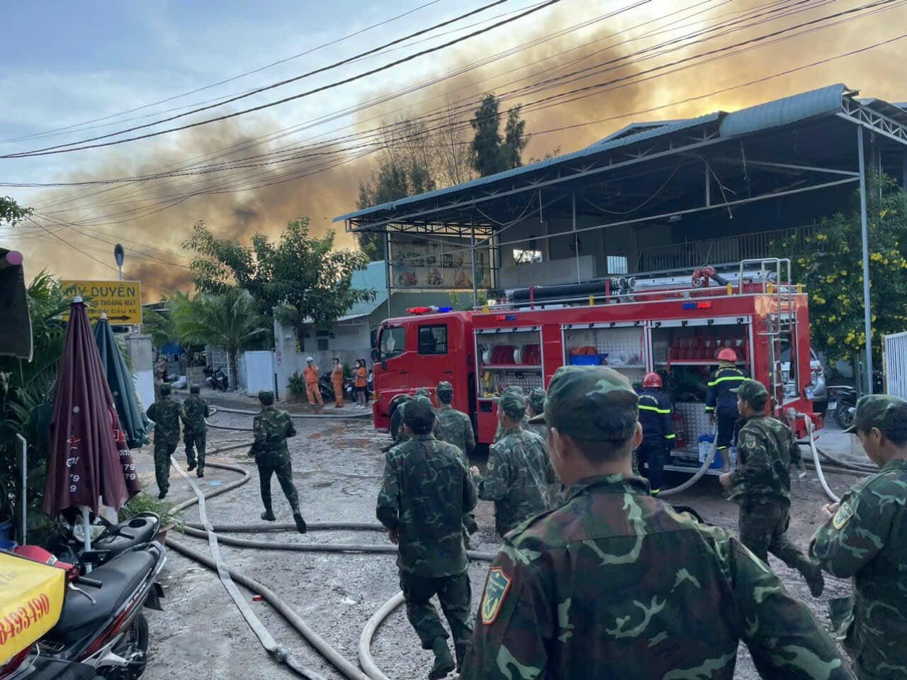 Hàng trăm cán bộ, chiến sĩ, DQTV Bộ CHQS tỉnh Bình Thuận tham gia ứng cứu, dập tắt đám cháy.