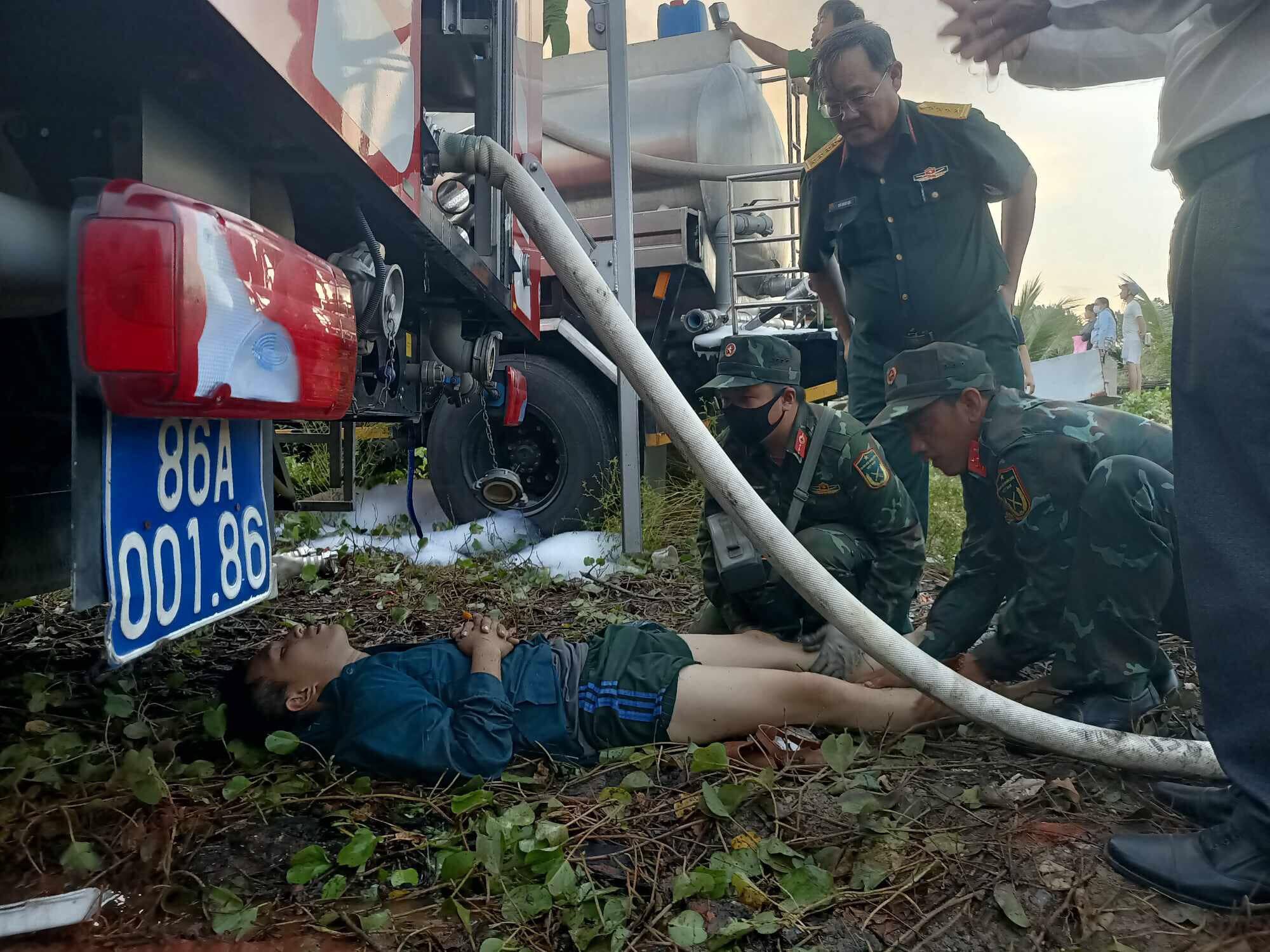 Chiến sĩ dân quân lả đi vì mệt mỏi, quá sức trong quá trình tham gia dập “giặc hỏa”.