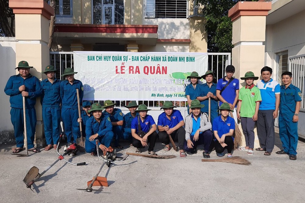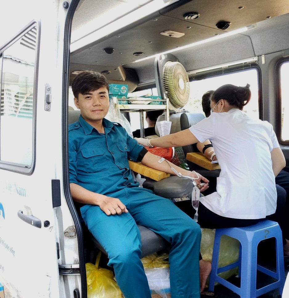 Dân quân xã Nhị Bình tham gia hiến máu tình nguyện.