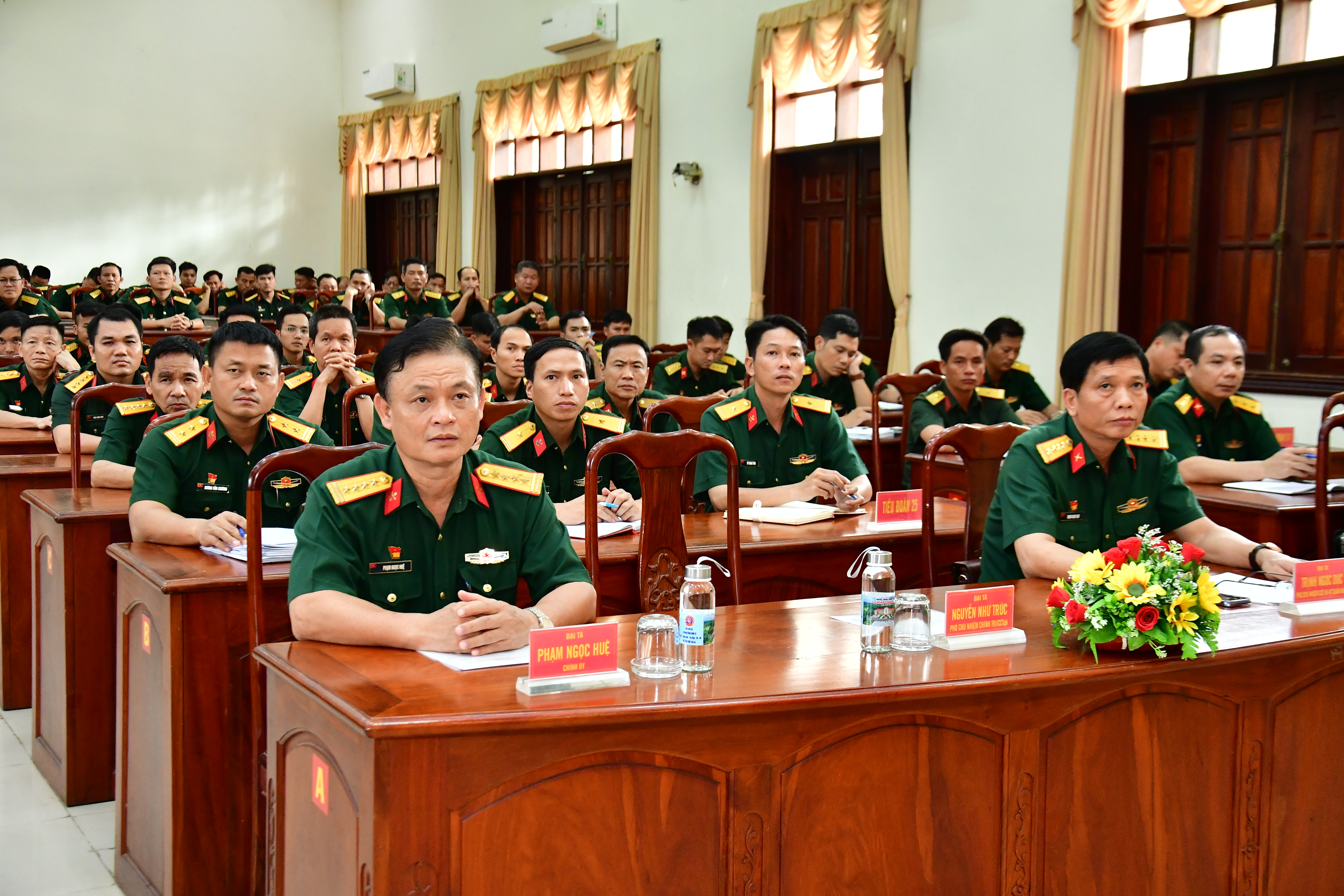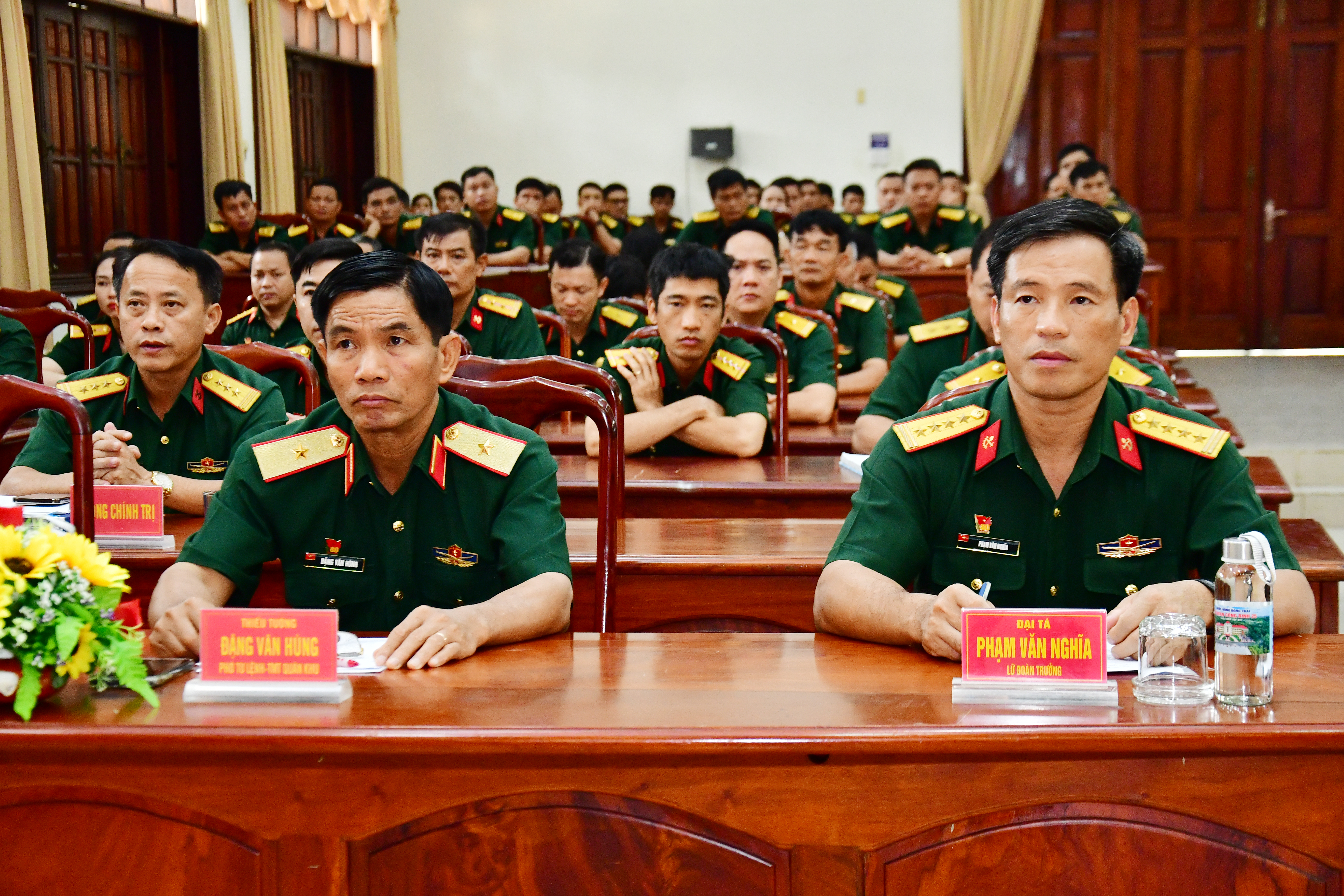 Thiếu tướng Đặng Văn Hùng, Phó Tư lệnh, Tham mưu trưởng Quân khu 7 (bên trái) dự và chỉ đạo hội nghị.