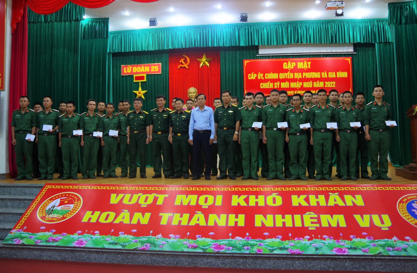 Chỉ huy lữ đoàn và đại diện cấp ủy, chính quyền địa phương tặng quà cho chiến sĩ mới.