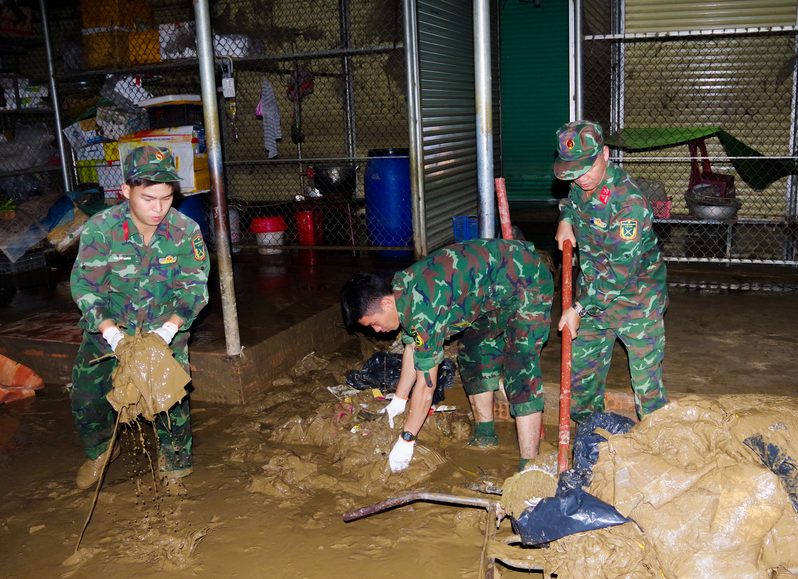 Cán bộ, chiến sĩ Lữ đoàn 25 tổ chức dọn bùn đất tại Chợ Cát Tiên.