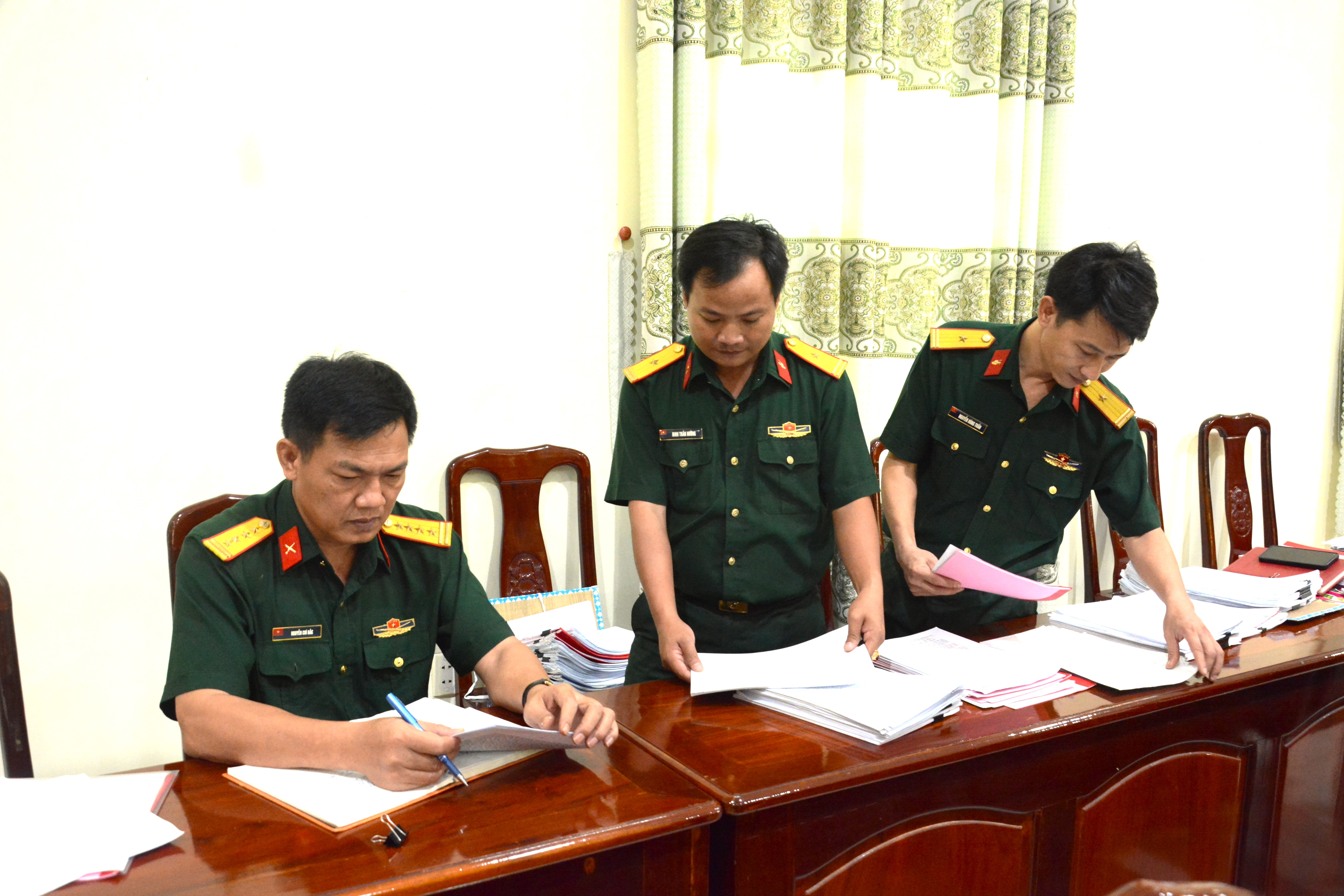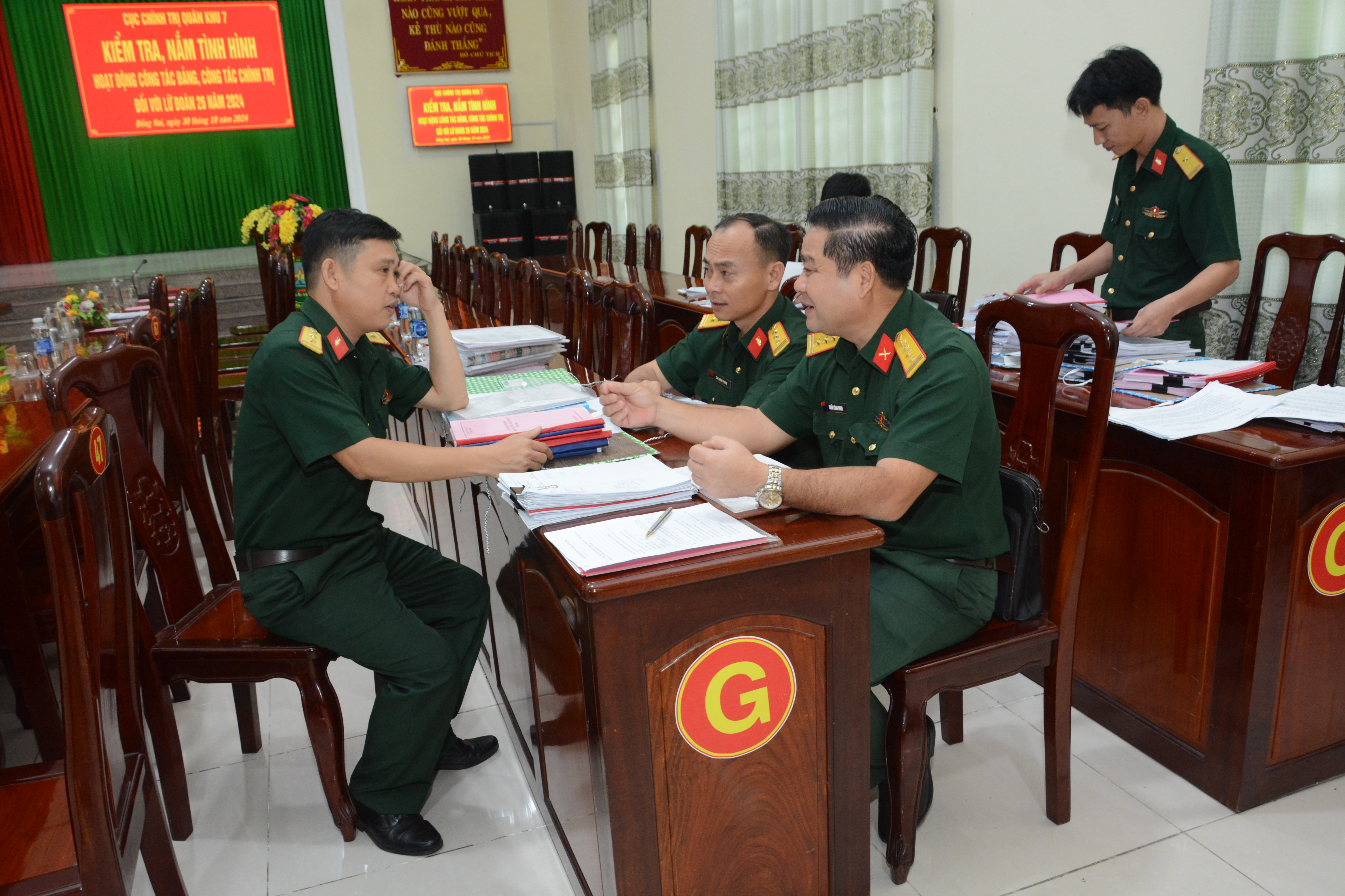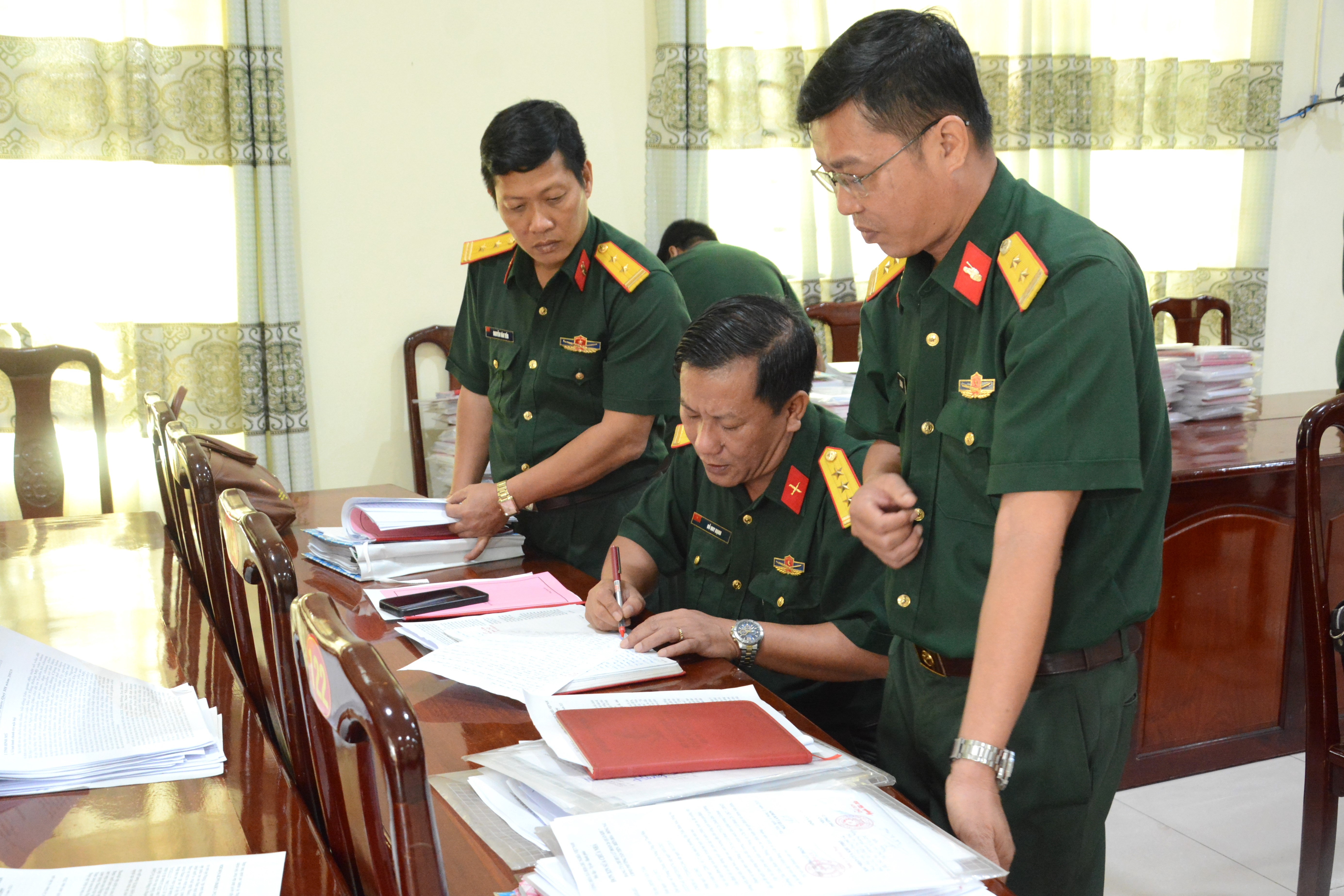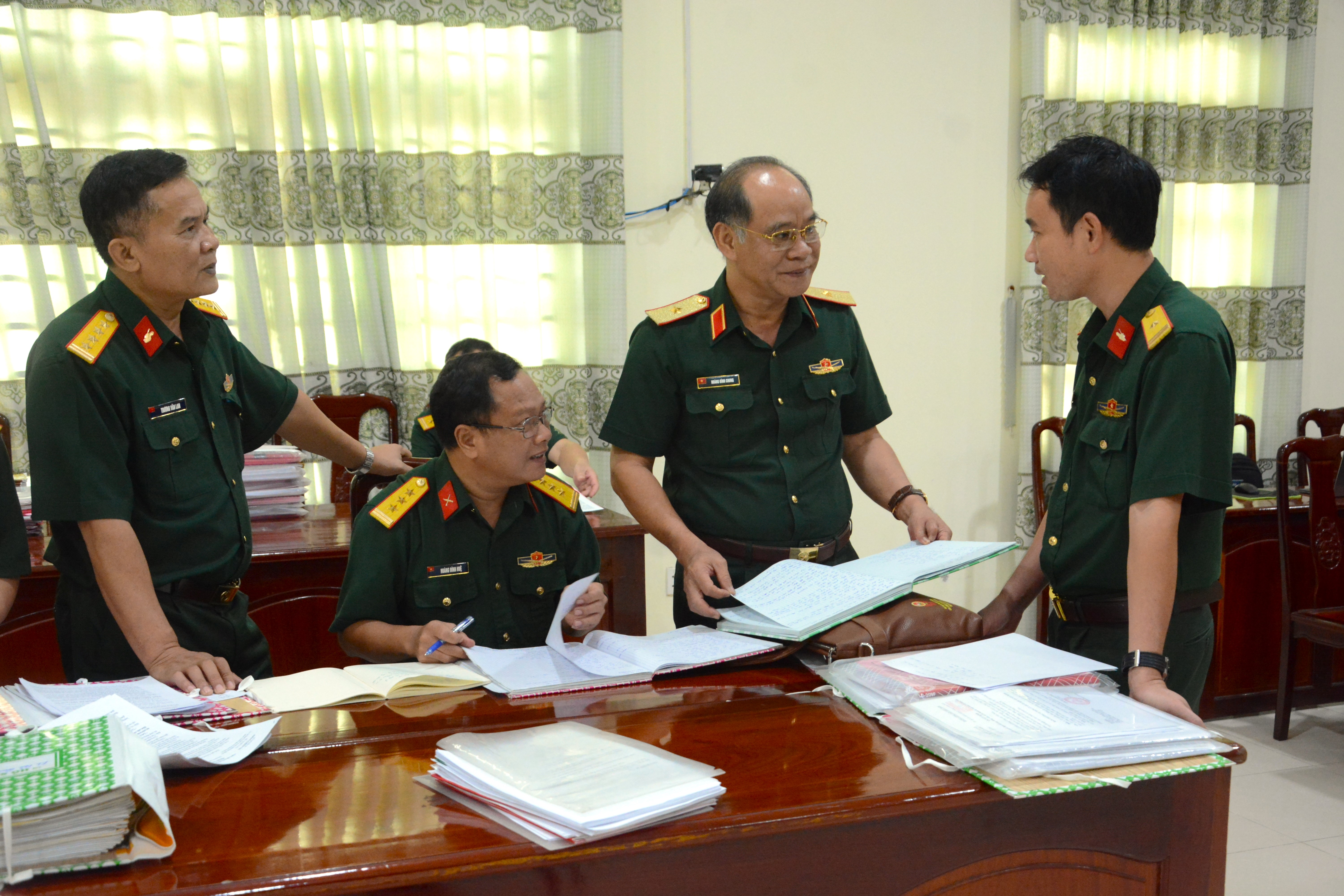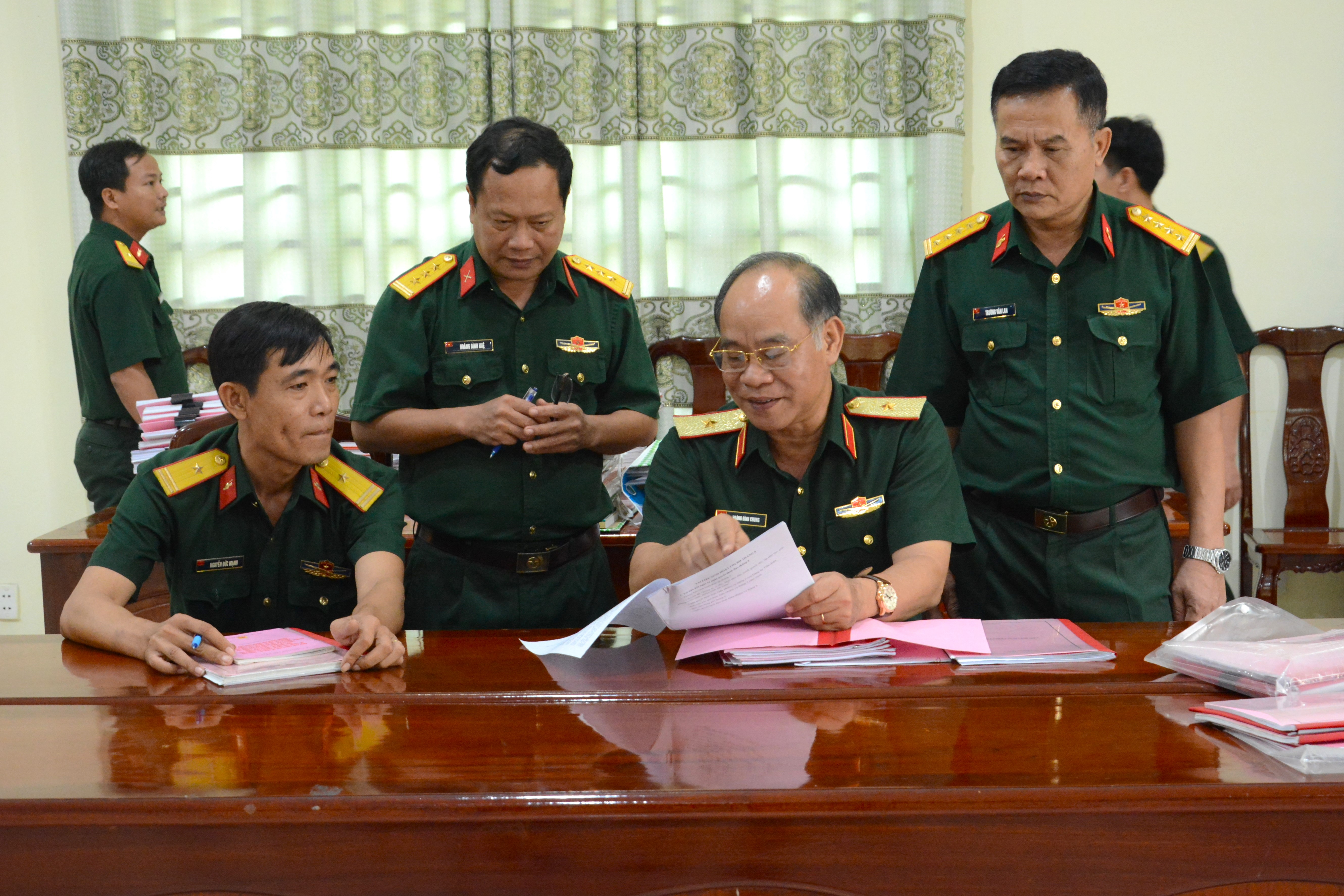 Thiếu tướng Hoàng Đình Chung kiểm tra các nghị quyết, biên bản sinh hoạt của Đảng ủy Tiểu đoàn 21, Lữ đoàn 26.
