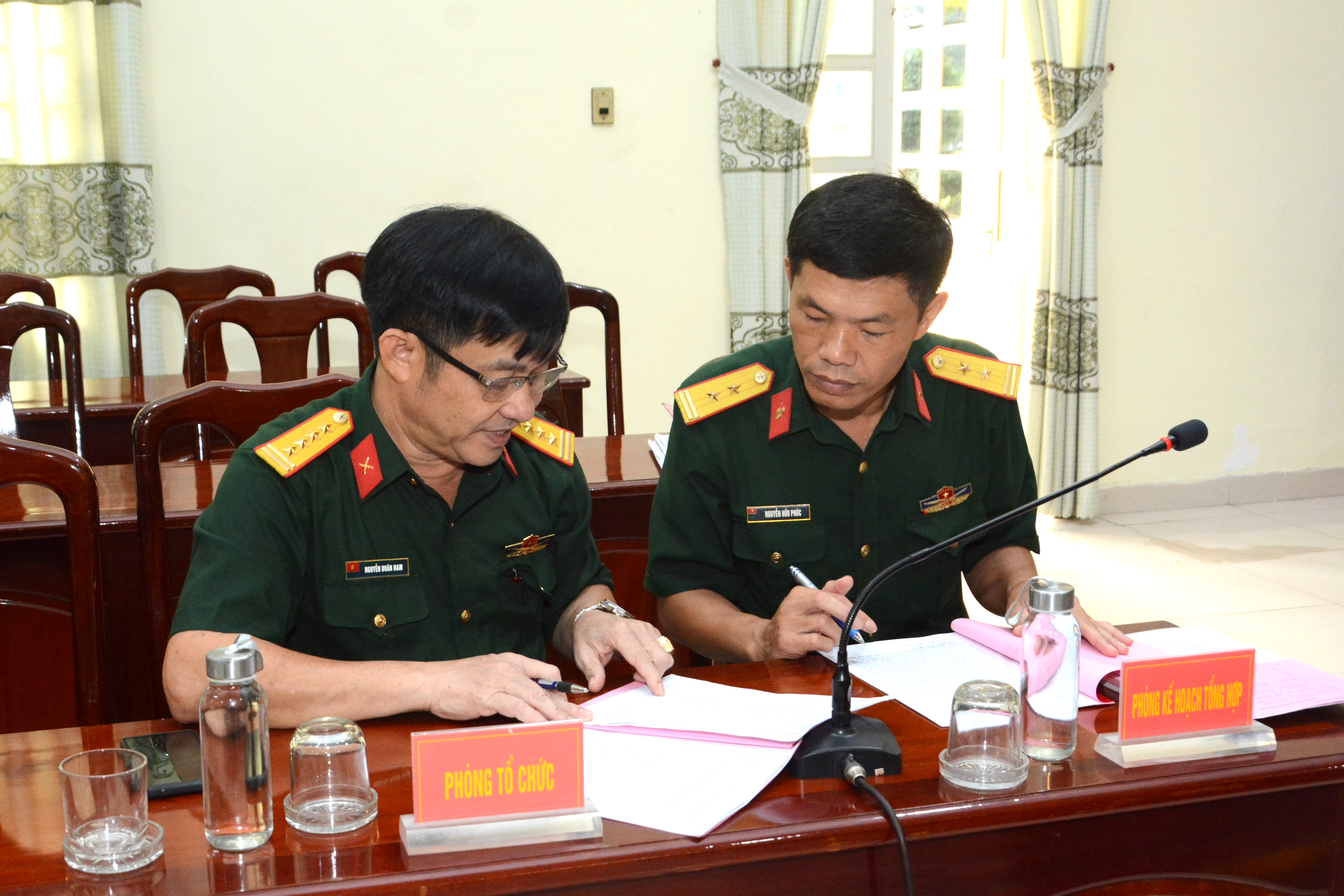 Đại tá Nguyễn Doãn Nam trưởng Phòng Kế hoạch - Tổng hợp, Cục Chính trị Quân khu hướng dẫn đơn vị hoàn chỉnh báo cáo trung tâm.