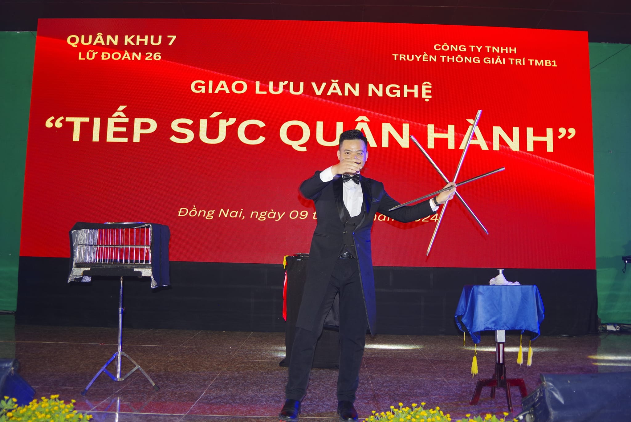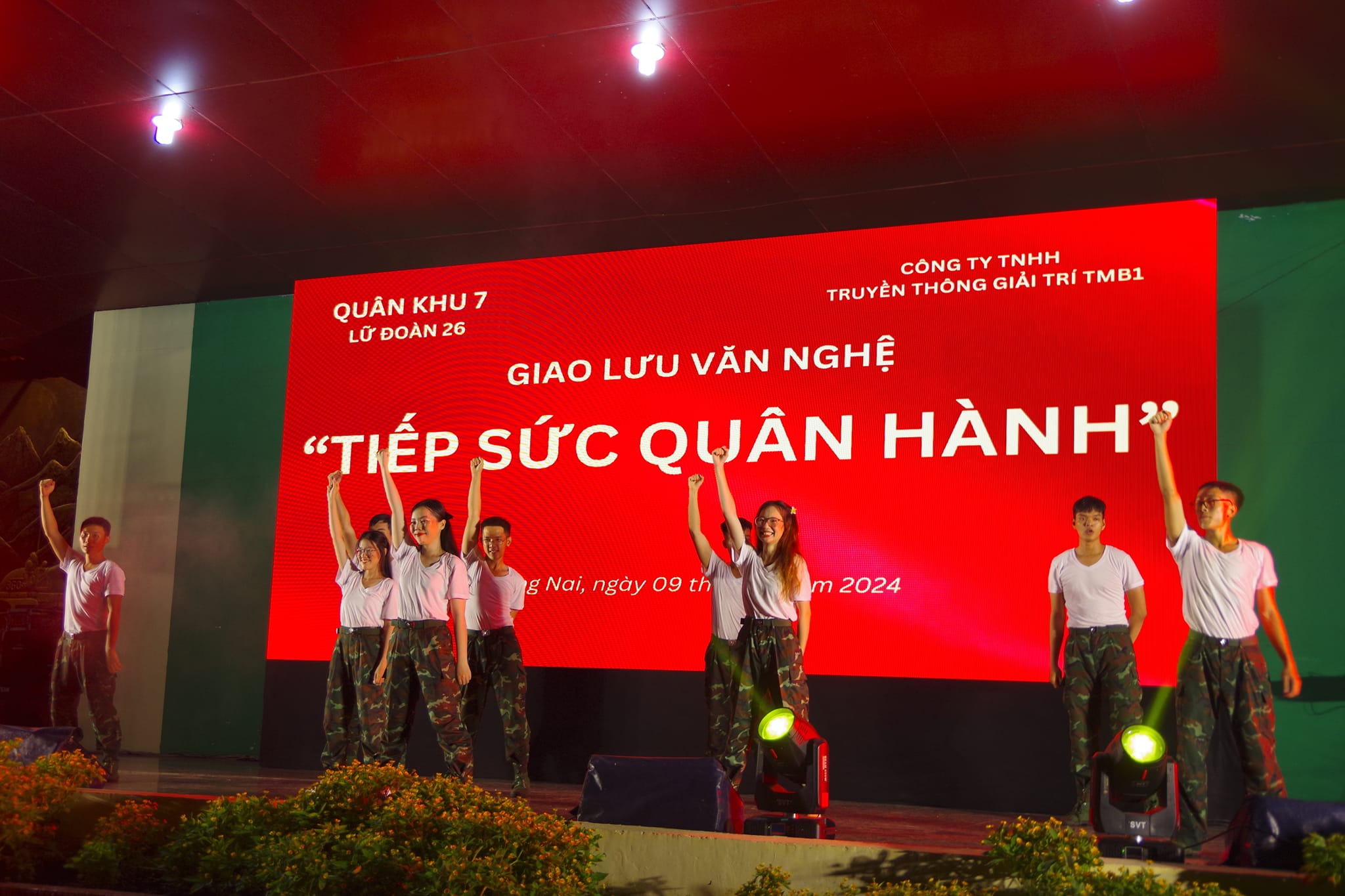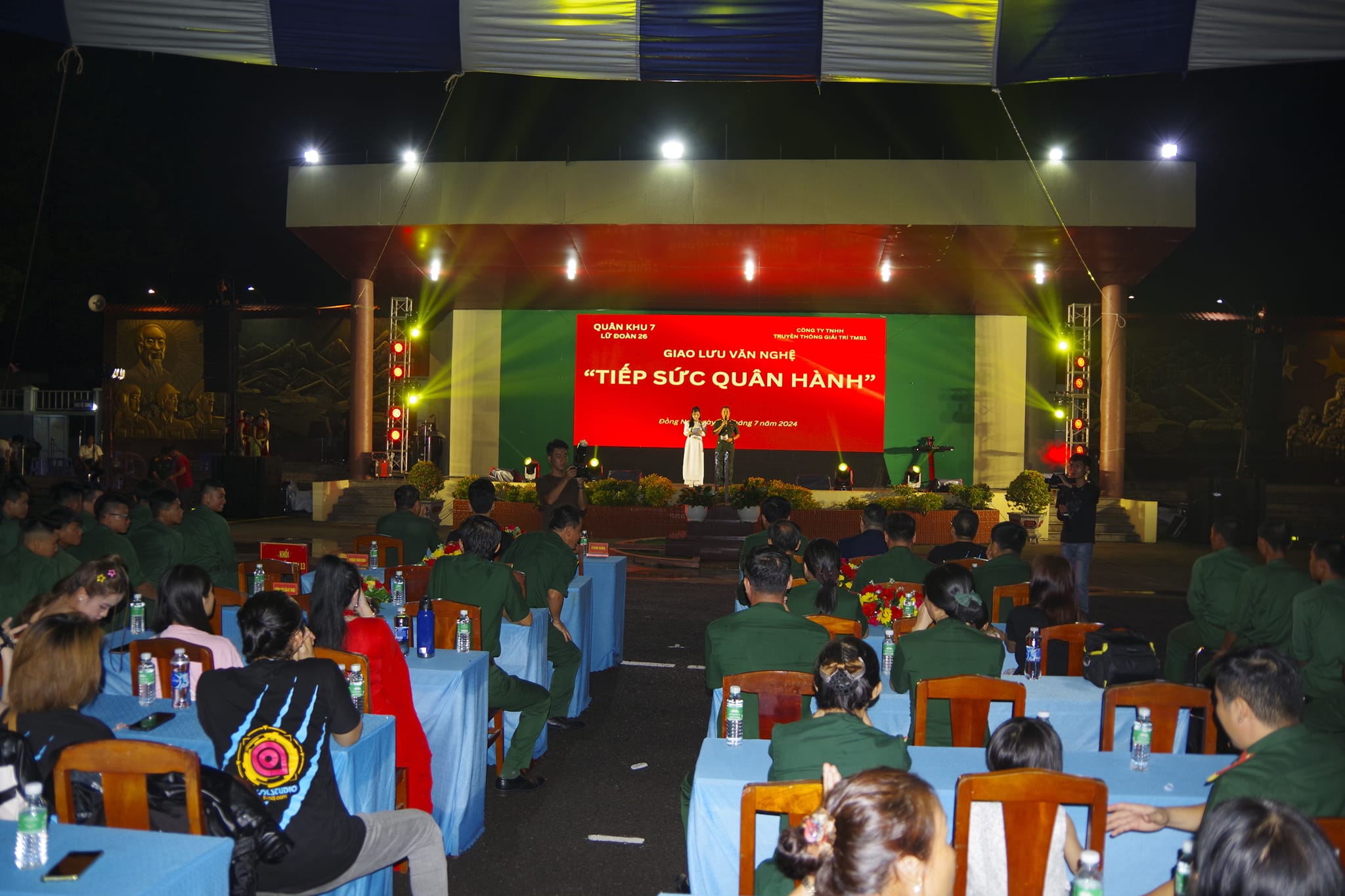 (QK7 Online) - Chào mừng Đại hội thi đua Quyết thắng LLVT Quân khu giai đoạn 2019 – 2024, tối 9/7, Lữ đoàn 26 phối hợp Công ty TNHH truyền thông và giải trí TMB1 có trụ sở tại Thành phố Hồ Chí Minh tổ chức đêm giao lưu văn nghệ với chủ đề “Tiếp sức quân hành”. Tham gia văn nghệ có cán bộ chiến sĩ của Lữ đoàn 75, Lữ đoàn 25 và bà con Nhân dân trên địa bàn đóng quân.