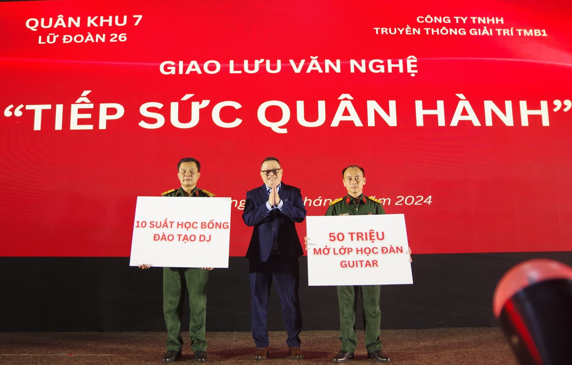 Tại đêm giao lưu, Công ty TNHH truyền thông và giải trí TMB1 tặng 10 suất học bổng (trị giá 30 triệu đồng/xuất) đào tạo âm nhạc cho chiến sĩ xuất ngũ năm 2024 và tặng 50 triệu đồng hỗ trợ Lữ đoàn 26 mở lớp học đàn Ghi ta cho cán bộ chiến sĩ.