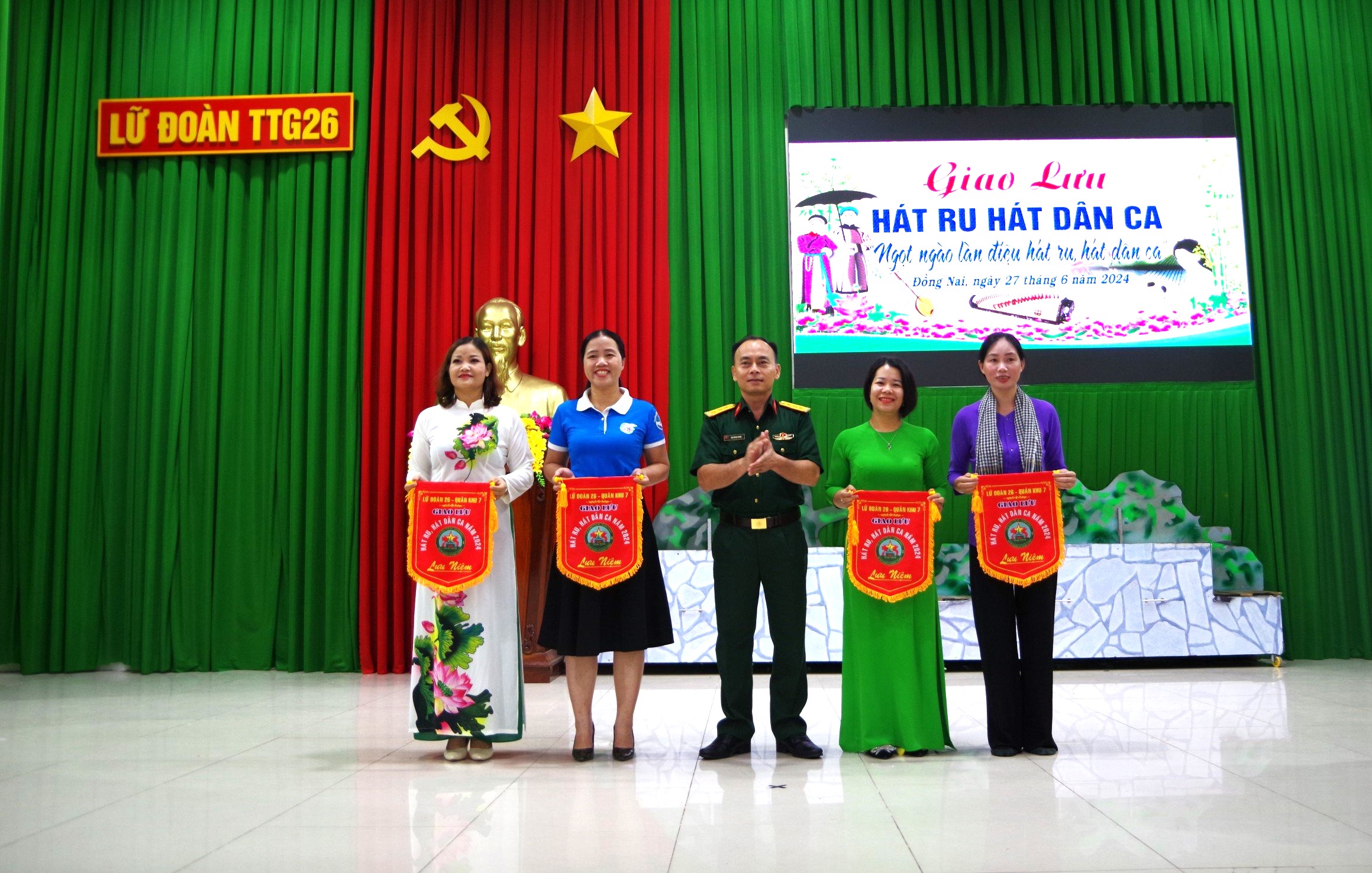 Thượng tá Cao Hoàng Phong, Phó Chính ủy Lữ đoàn 26 tặng cờ lưu niệm cho các đơn vị tham gia giao lưu.