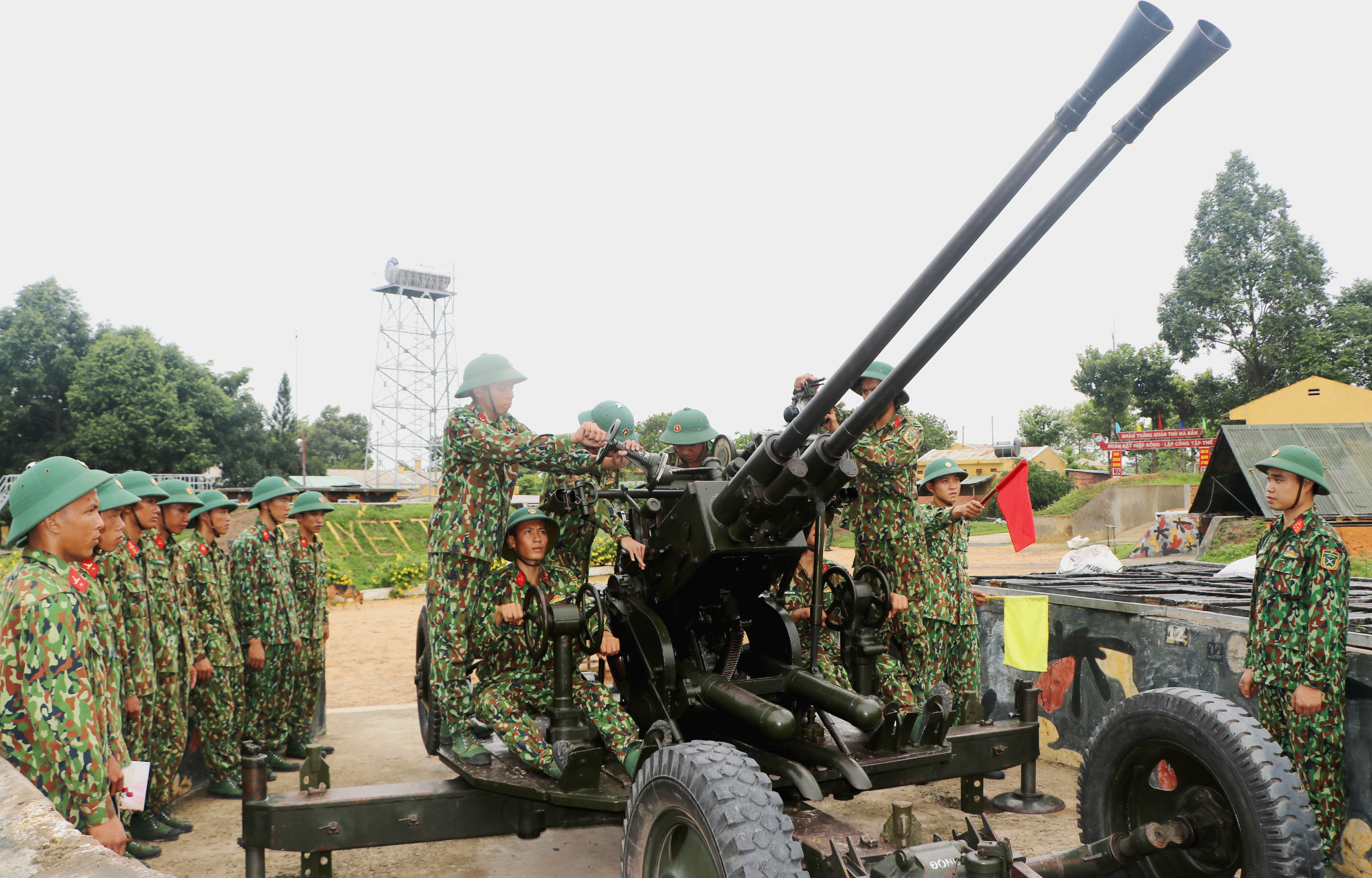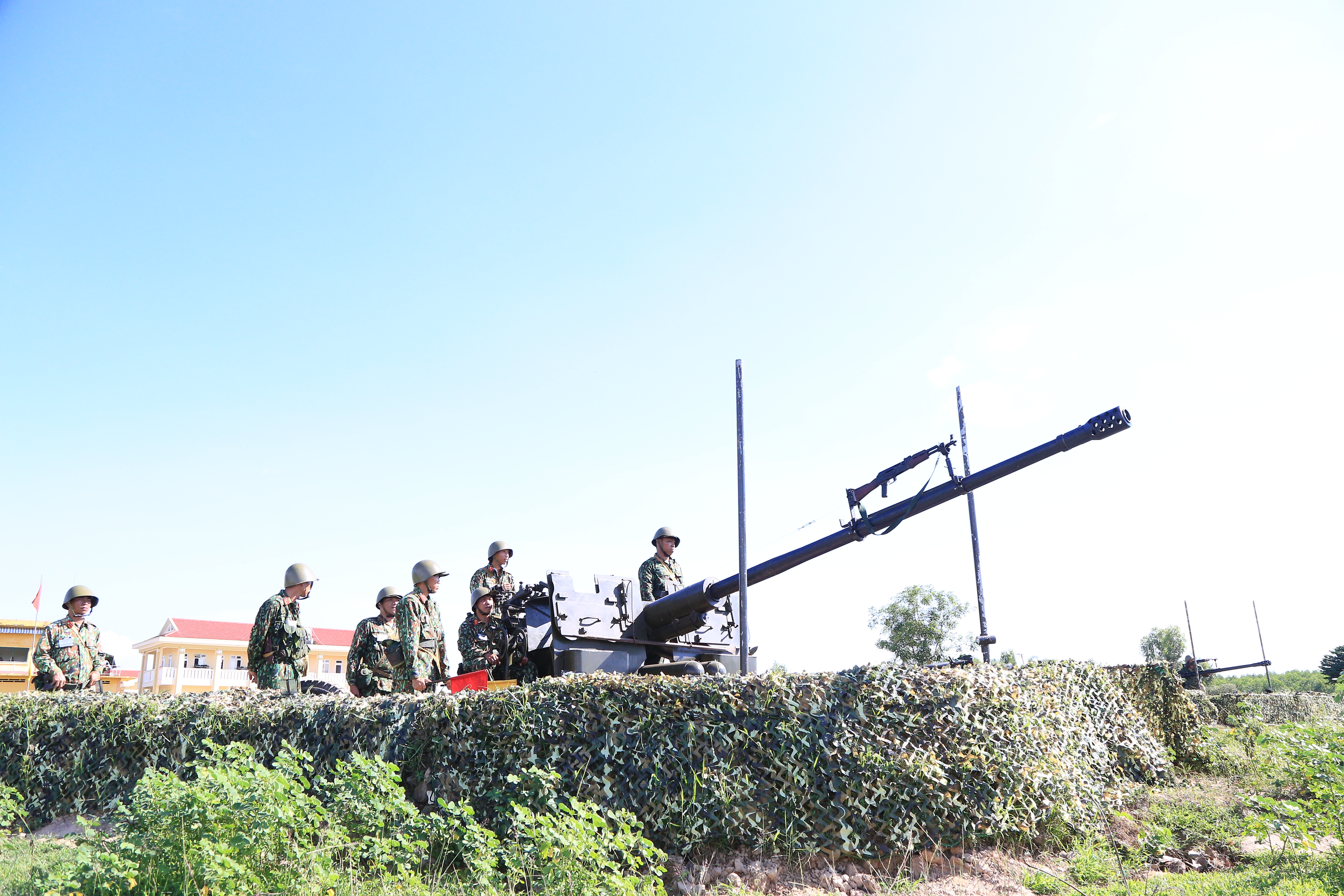 Lữ đoàn 77 diễn tập Tiểu đoàn Dự bị động viên bắn đạn thật Pháo Phòng không 57mm (kẹp nòng súng Tiểu liên AK). Ảnh: Thế Anh