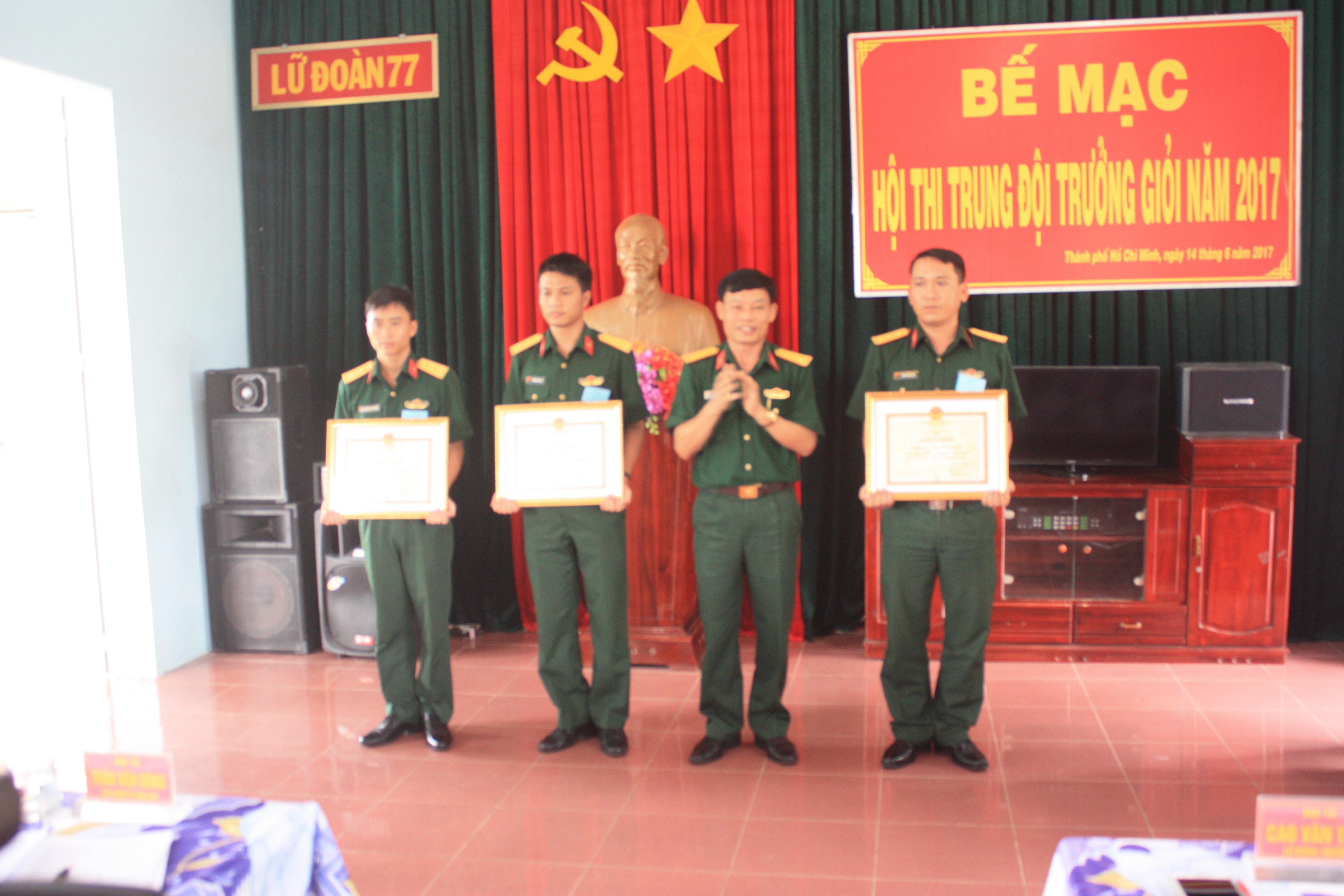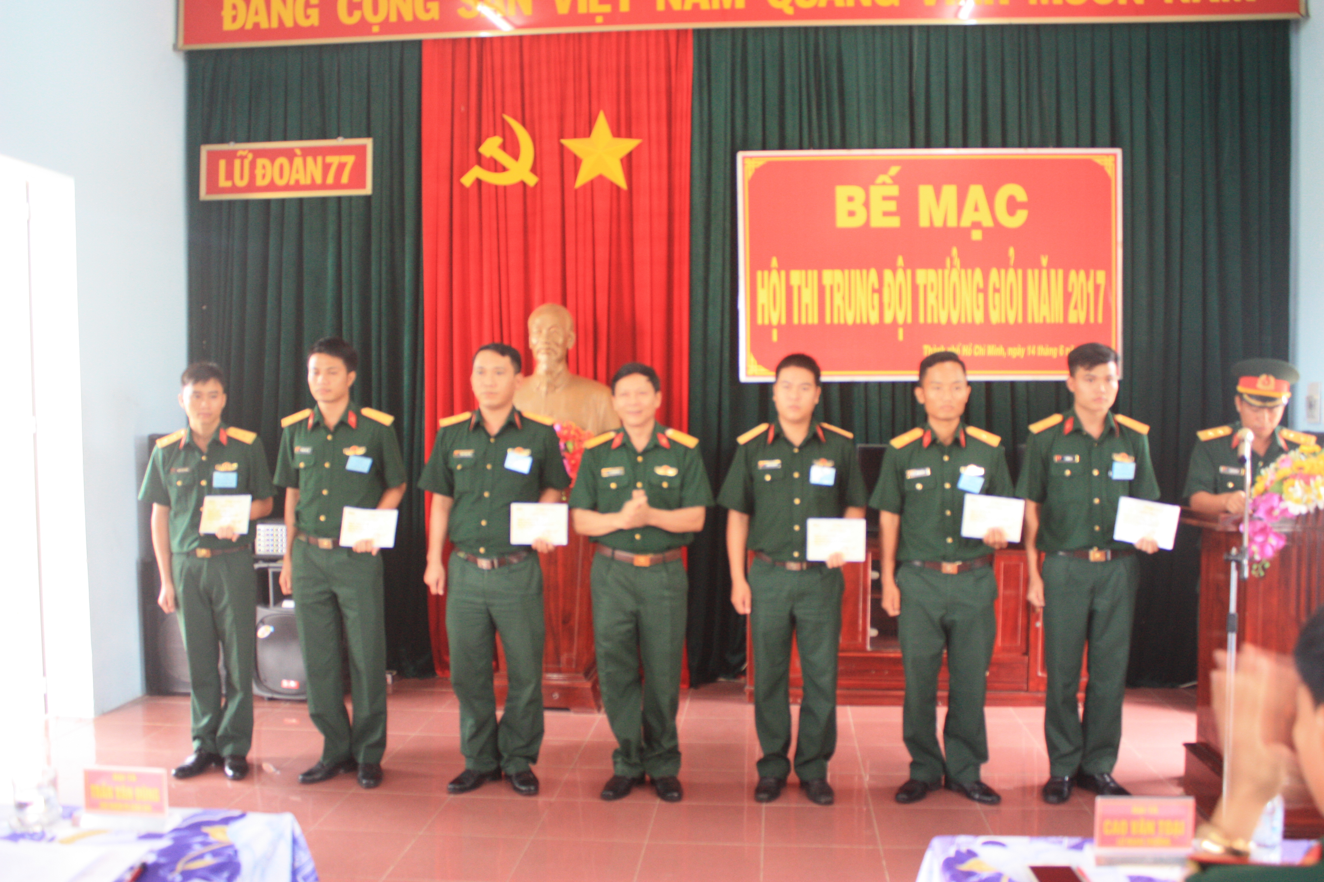 Kết quả 100% các thí sinh đạt khá, giỏi (có 6 đồng chí đạt điểm giỏi). Ban tổ chức đã trao giải nhất cho đồng chí trung úy Nguyễn Văn Cương - Trung đội trưởng - Tiểu đoàn 3, giải nhì cho đồng chí Dương Đức Luật - Trung đội trưởng - Tiểu đoàn 1, giải ba cho đồng chí Trịnh Thanh Sâm - Trung đội trưởng - Tiểu đoàn 1 đạt kết quả cao trong hội thi và công nhận 6 đồng chí đạt danh hiệu cán bộ trung đội trưởng giỏi cấp Lữ đoàn năm 2017.