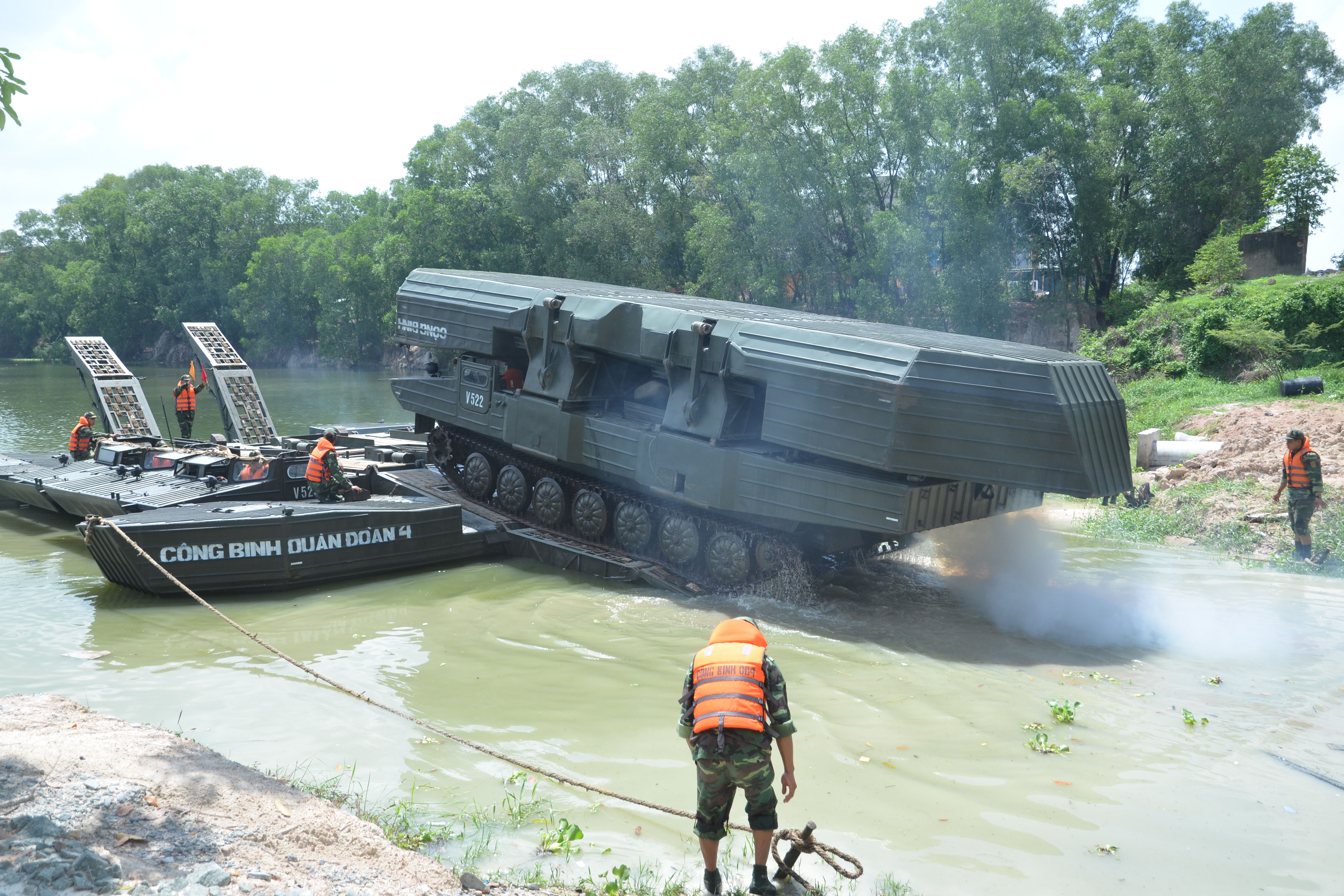 Cán bộ, chiến sĩ Tiểu đoàn 25, Lữ đoàn 550 huấn luyện phà tự hành phục vụ vượt sông cho các phương tiện, khí tài.