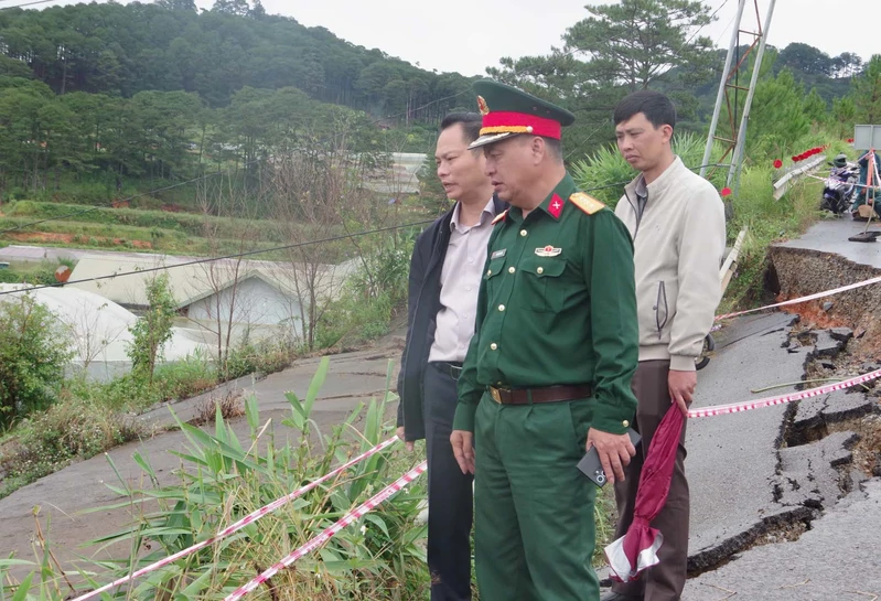 Đại tá Đinh Hồng Tiếng, Ủy viên Ban Thường vụ Tỉnh ủy, Chỉ huy trưởng Bộ CHQS tỉnh, Phó Ban chỉ đạo Ban Chỉ huy Phòng thủ dân sự tỉnh có mặt tại hiện trường vụ sạt lở tại đường Bidoup, xã Lạc Dương.