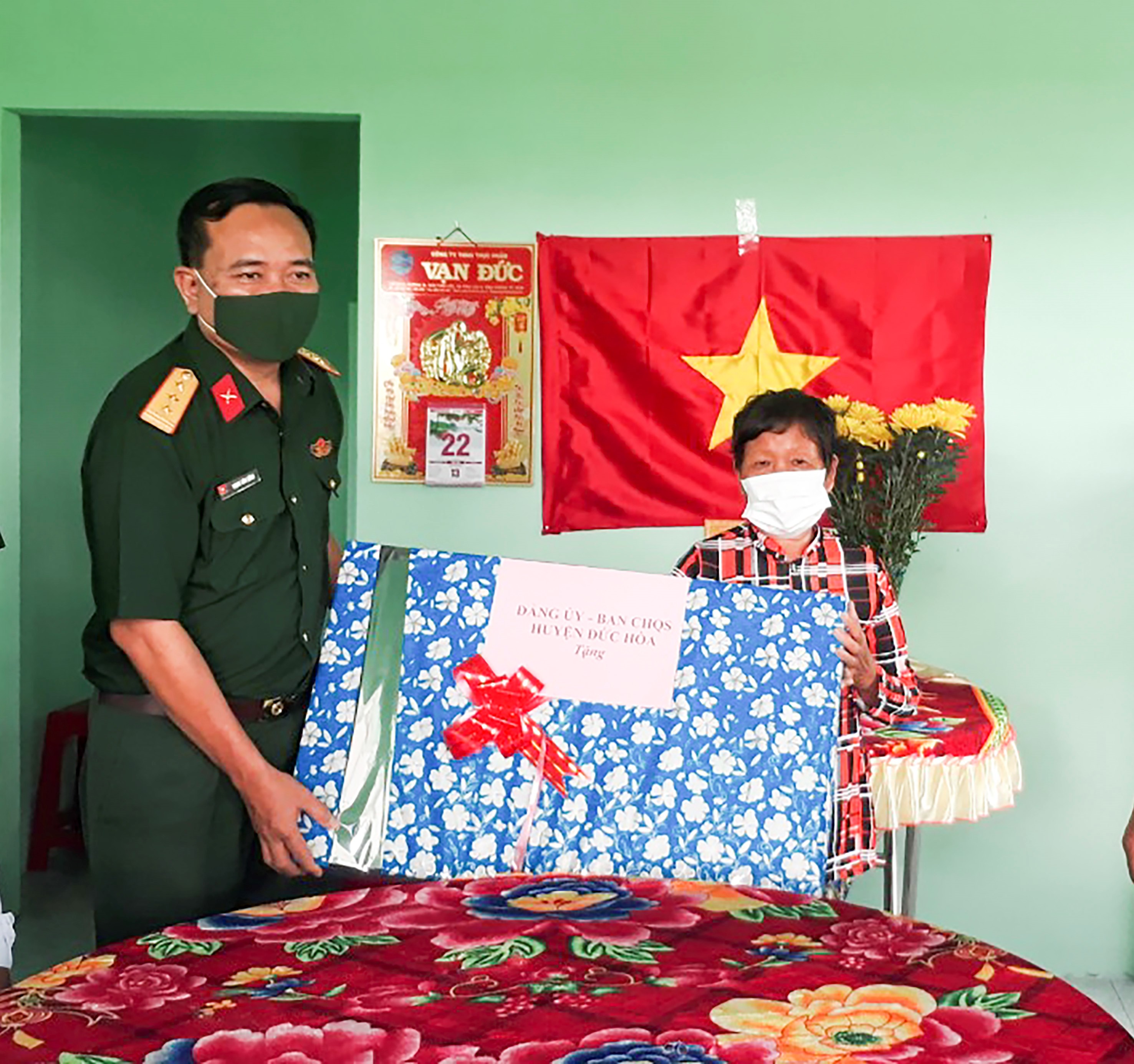Thấu hiểu hoàn cảnh của bà, Ban CHQS huyện Đức Hòa đóng góp, vận động các nhà hảo tâm hỗ trợ tổng kinh phí 100 triệu đồng xây dựng căn nhà cho bà Hoa. Căn nhà cấp 4 có diện tích 70 m2, tường sơn, mái lợp tôn, gồm 1 phòng khách, 1 phòng ngủ, 1 phòng bếp và công trình phụ. Ngoài ra, Ban CHQS huyện và các nhà hảo tâm còn tặng nhiều phần quà là những vật dụng sinh hoạt giúp gia đình ổn định cuộc sống, vơi bớt khó khăn thiếu thốn.