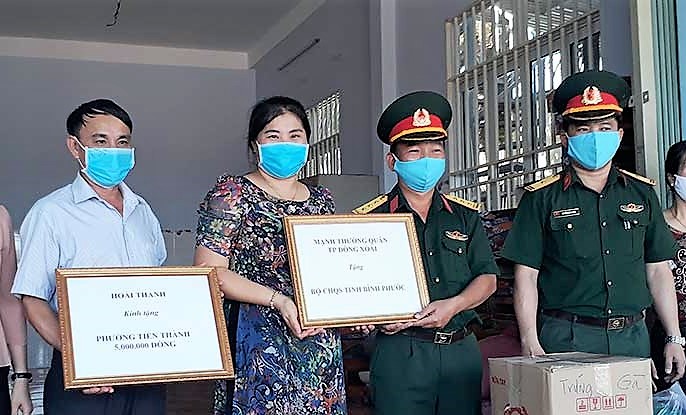 (QK7 Online) - Ngày 5/4, hưởng ứng lời kêu gọi cùng chung tay ủng hộ phòng, chống dịch Covid-19, gia đình chị Nguyễn Thị Thanh, ngụ khu phố 3 phường Tiến Thành, thành phố Đồng Xoài, tỉnh Bình Phước và các mạnh thường quân tặng nhiều nhu yếu phẩm cho Bộ chỉ huy Quân sự tỉnh.