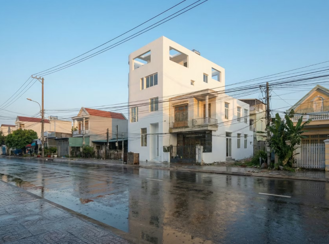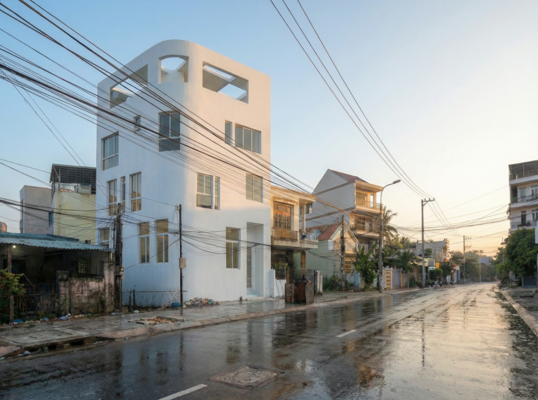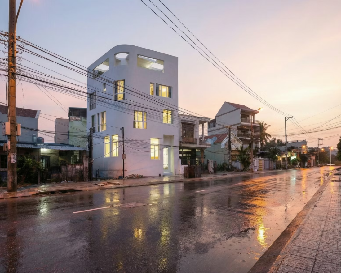 Nằm giữa khu vực ngoại ô Nha Trang với những nếp nhà tự phát, hệ thống hạ tầng chằng chịt và tiếng ồn đô thị đặc trưng, ngôi nhà hiện lên như một khối trắng bo cong tiết chế.