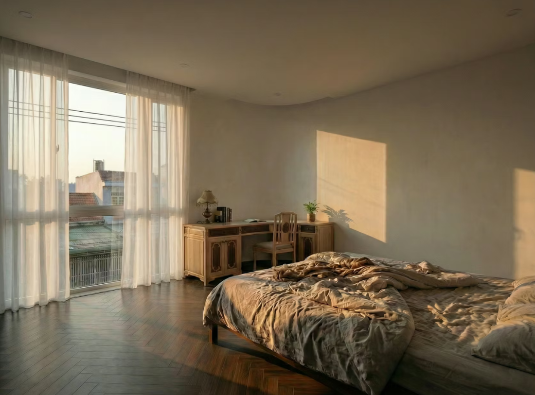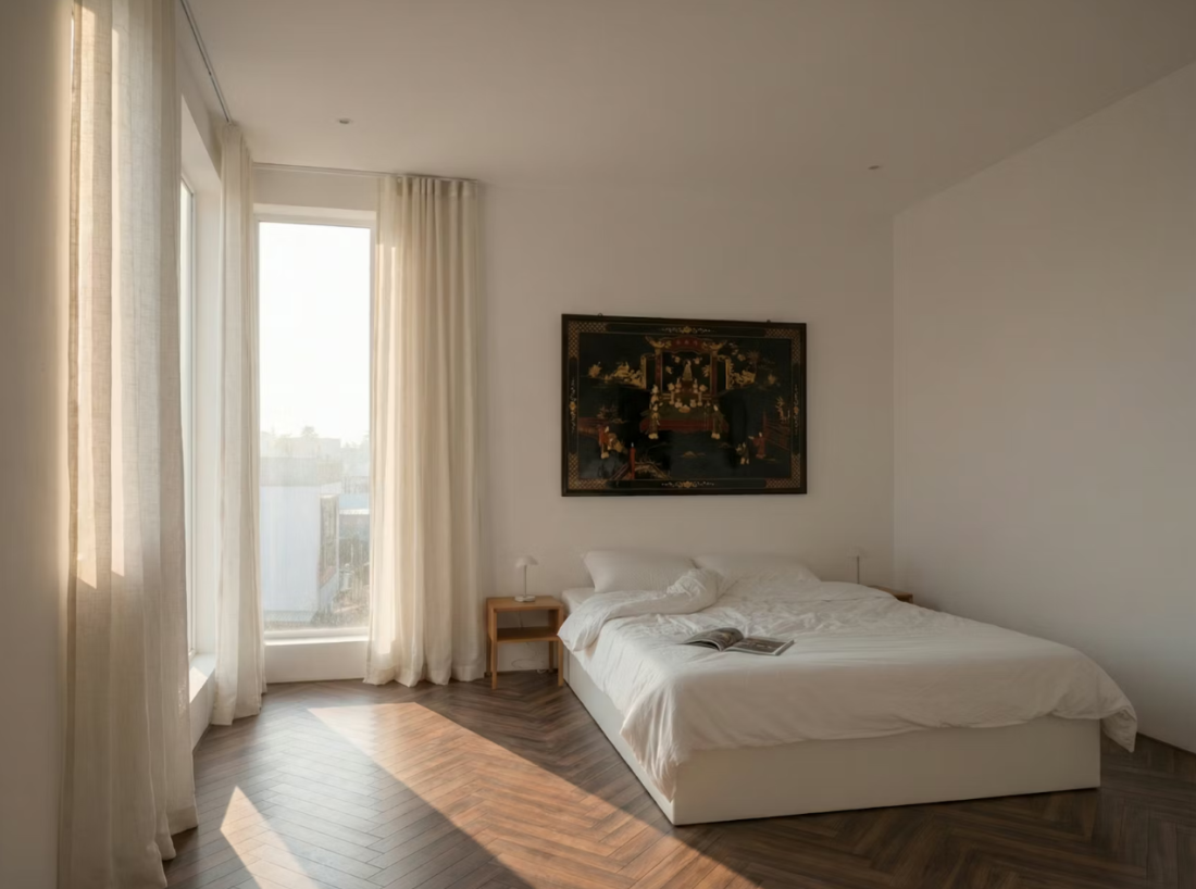 Bên trong mỗi phòng ngủ đều sử dụng sàn gỗ xương cá, nội thất tiết chế, rèm trắng cửa kính bản lớn. Tất cả ưu tiên cho khoảng trống và ánh sáng tự nhiên.