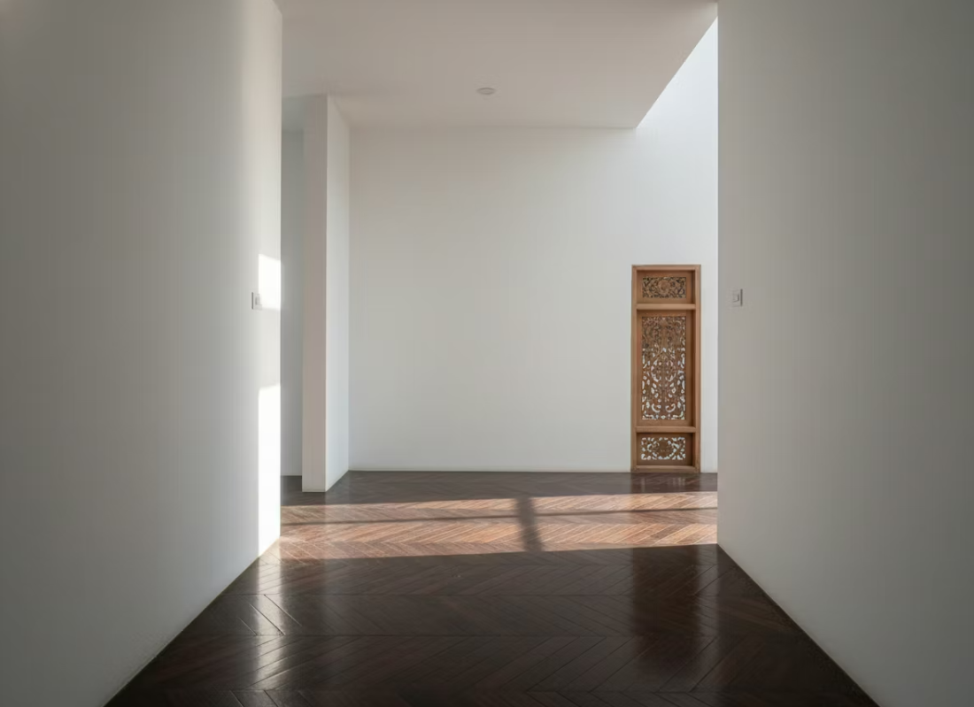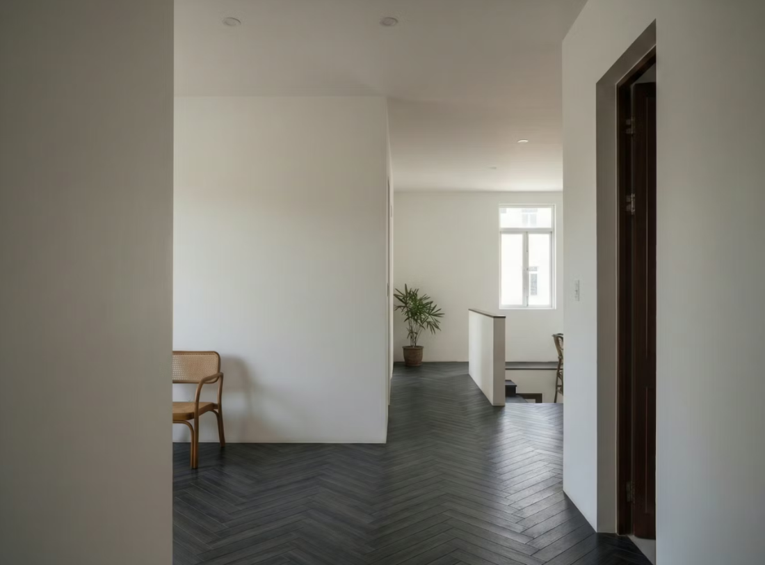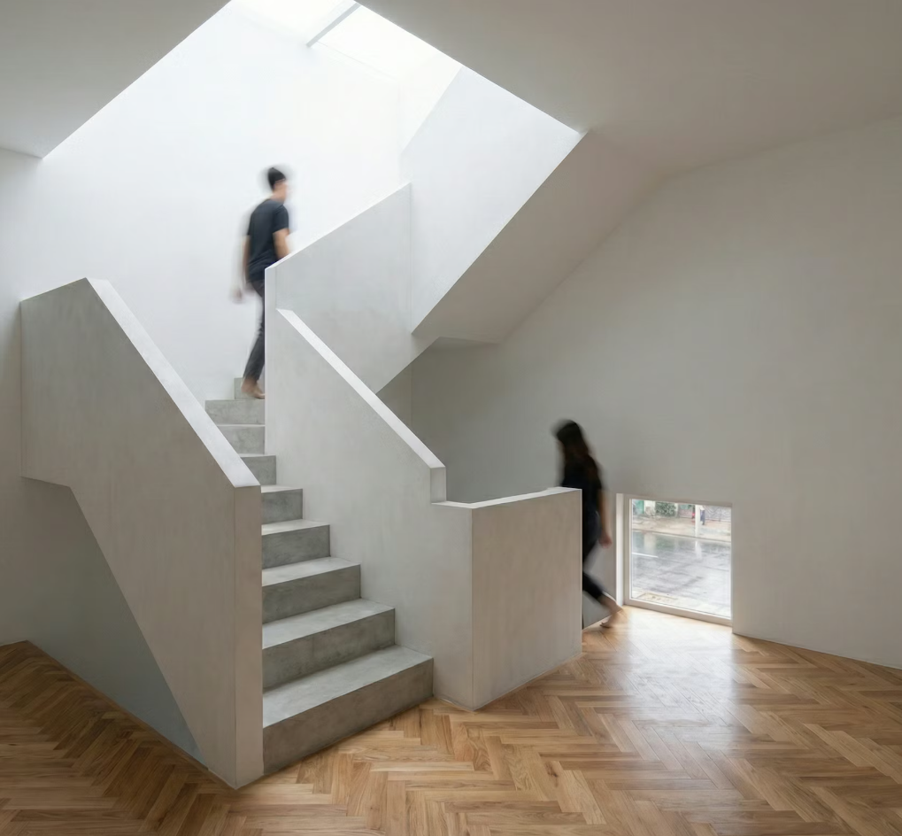 Bước vào bên trong, cấu trúc ngôi nhà được tổ chức chặt chẽ dọc theo trục đứng – một kiểu cấu trúc quen thuộc của nhà phố Việt Nam nhưng được tinh chỉnh để đạt tới sự tinh khiết tối đa. Thay vì sử dụng các chi tiết trang trí cầu kỳ, kiến trúc sư chọn ánh sáng làm chất liệu chủ đạo. Khu vực sinh hoạt chung được bao phủ bởi một bầu không khí dịu nhẹ, giúp tâm trí con người dễ dàng lắng lại và tìm thấy sự bình an.