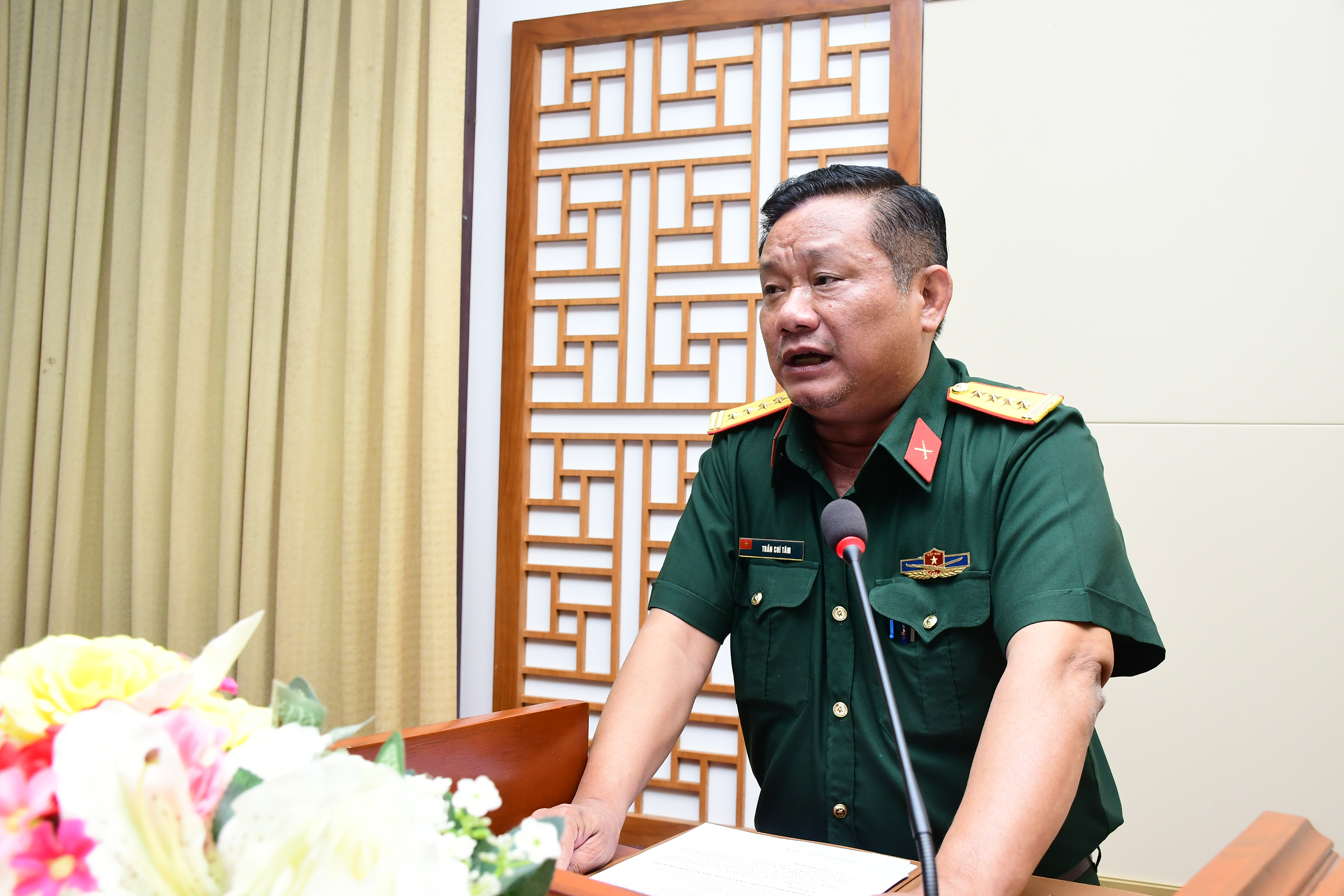 Đại tá Trần Chí Tâm, Trưởng phòng Cán bộ Quân khu trình bày báo cáo về tình hình đội ngũ sĩ quan biệt phái trong LLVT Quân khu.