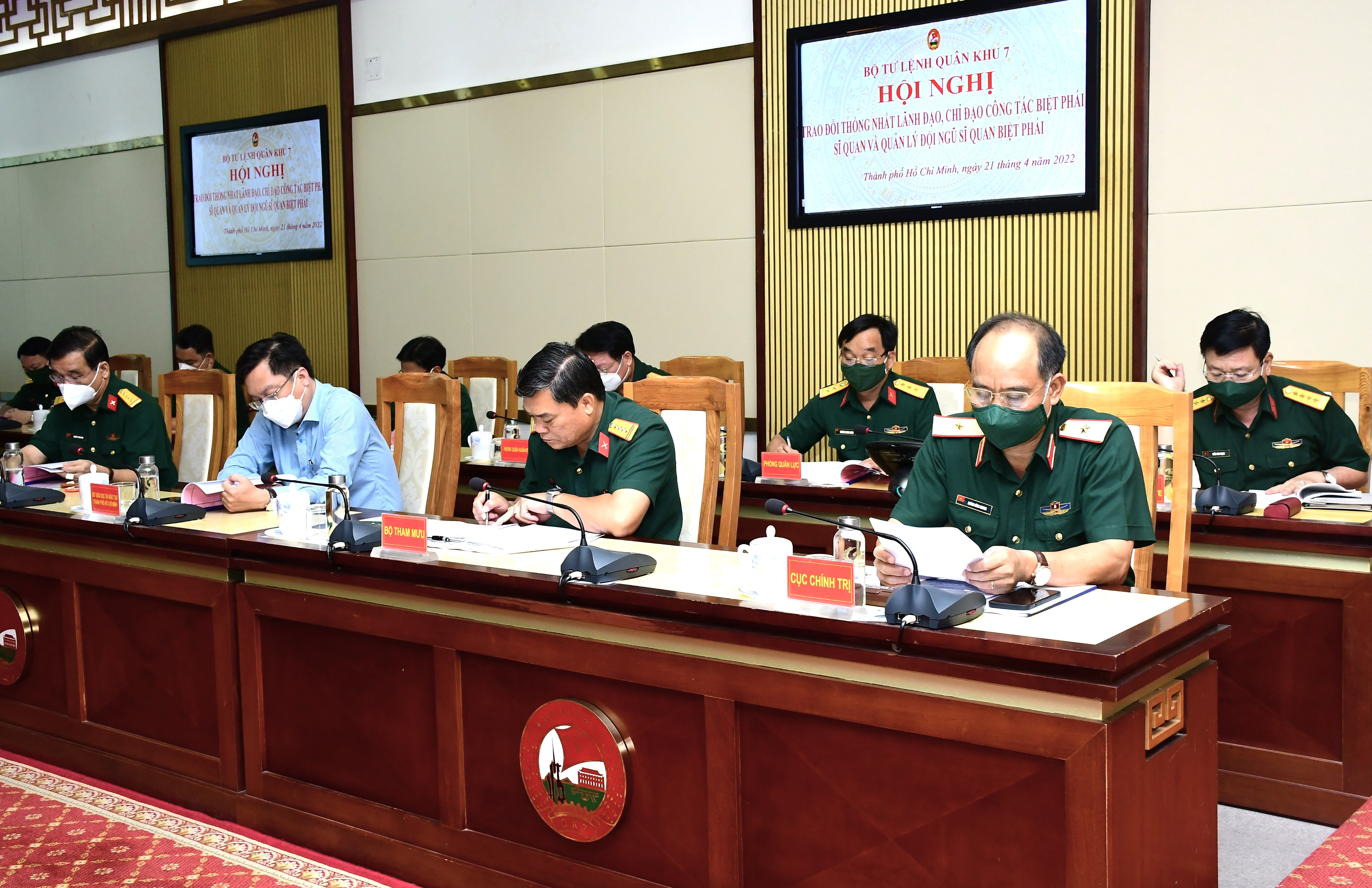 (QK7 Online) – Sáng 21/4, Bộ Tư lệnh Quân khu 7 tổ chức hội nghị trao đổi thống nhất lãnh đạo, chỉ đạo công tác biệt phái sĩ quan và quản lý đội ngũ sĩ quan biệt phái (SQBP).Trung tướng Trần Hoài Trung, Bí thư Đảng ủy, Chính ủy Quân khu chủ trì hội nghị.