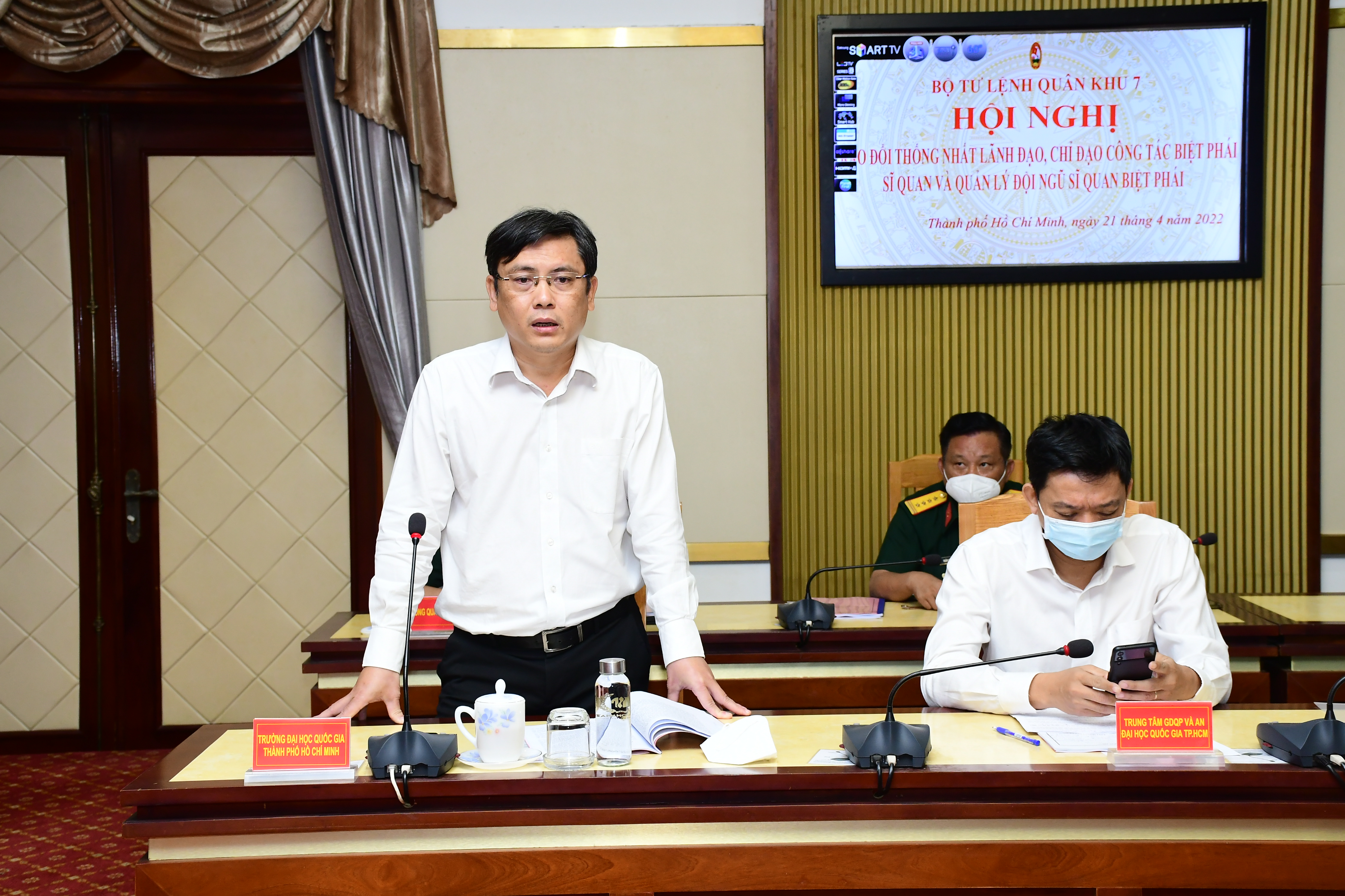 Tham dự hội nghị có Thiếu tướng Hoàng Đình Chung, Ủy viên Thường vụ Đảng ủy Quân khu, Chủ nhiệm Chính trị Quân khu và Thủ trưởng các cơ quan Quân khu; đại diện lãnh đạo Đại học Quốc gia TPHCM, Đại học Đà Lạt; Trường Quân sự Quân khu 7; Trung tâm Giáo dục Quốc phòng – An ninh Đại học Quốc gia TPHCM; Sở Giáo dục - Đào tạo TPHCM và các tỉnh Đồng Nai, Lâm Đồng, Long An.