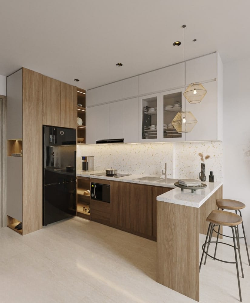 - Tối ưu không gian lưu trữ: sử dụng tủ bếp kịch trần, kệ treo tường hoặc ngăn kéo thông minh.