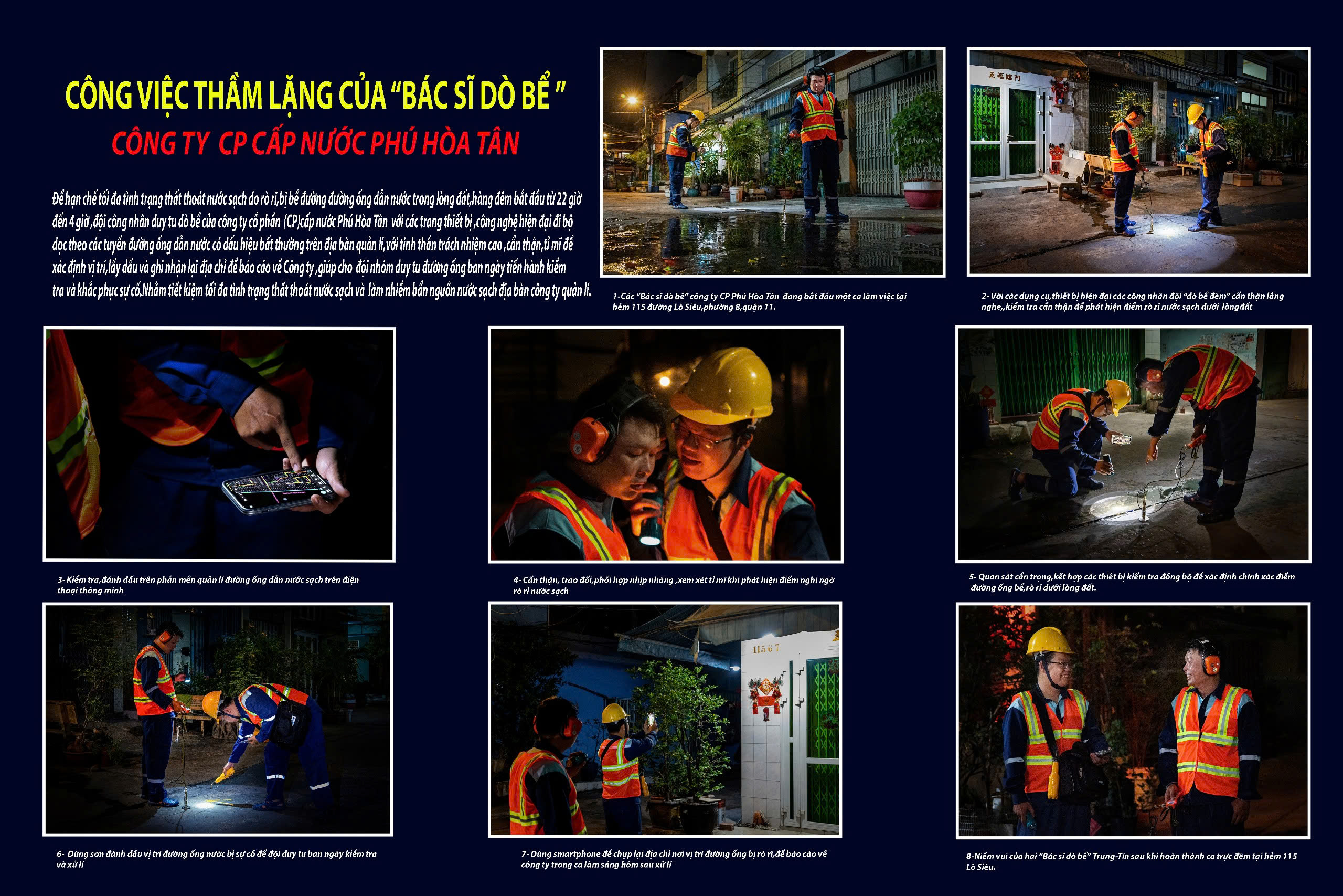 Tác giả Kiều Anh Dũng đạt giải nhất với bộ ảnh "Bác sĩ dò bể” và những công việc thầm lặng. "Công việc dò bể bắt đầu từ 10 giờ đêm đến 4 giờ sáng khi đường sá bắt đầu vắng vẻ. Với bộ ảnh của mình, tôi muốn tôn vinh và giới thiệu để nhiều người hiểu thêm về công việc của các “bác sĩ dò bể” - tác giả chia sẻ.