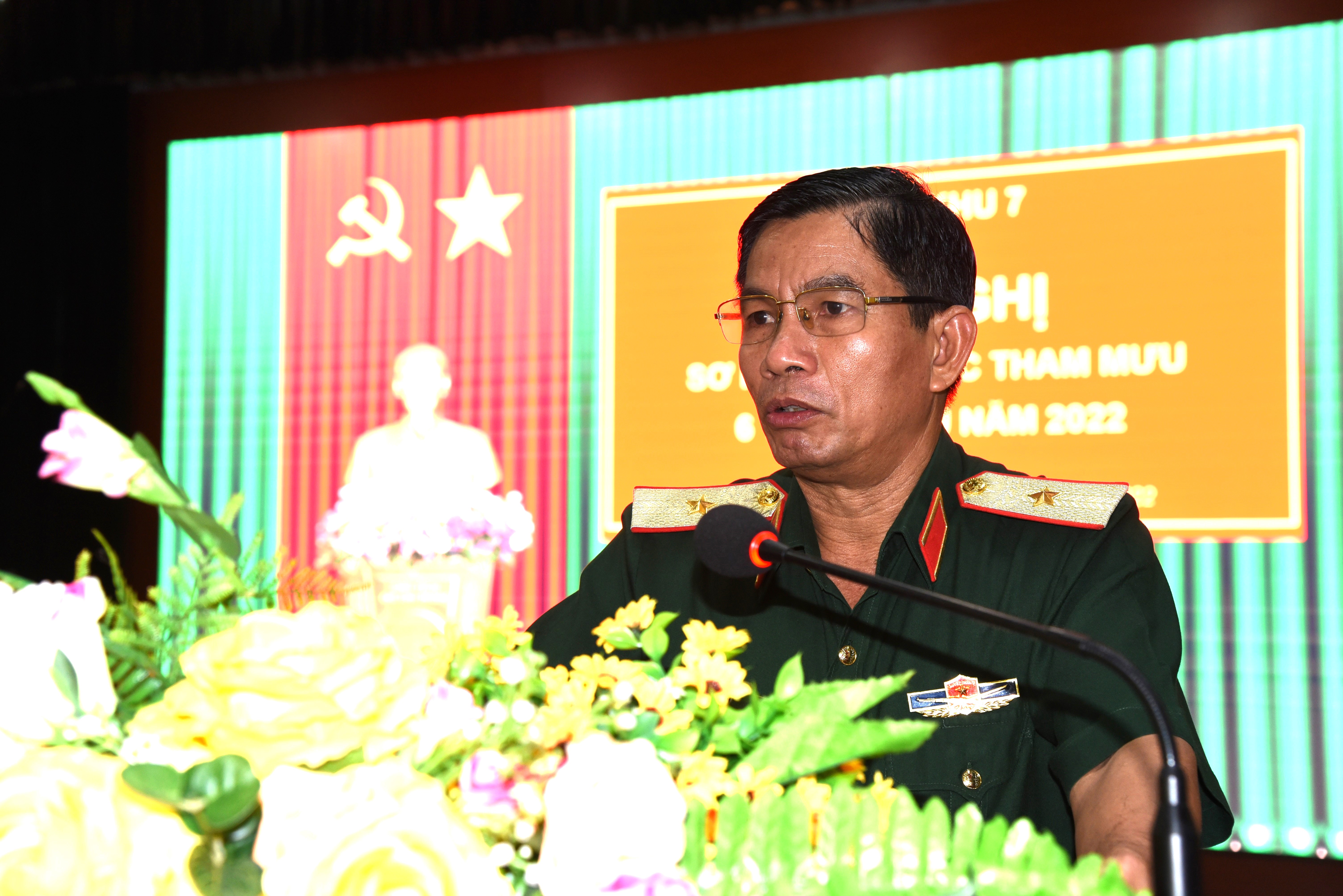 Thiếu tướng Nguyễn Văn Hoàng, Phó Tham mưu trưởng Quân khu báo cáo kết quả công tác tham mưu 6 tháng đầu năm 2022, ngành Tham mưu Quân khu thực hiện tốt chức năng tham mưu triển khai thực hiện tốt các nghị định, chỉ thị, kế hoạch, hướng dẫn của Chính phủ, Bộ Quốc phòng, Bộ Tư lệnh Quân khu; tham mưu chính xác, kịp thời cho lãnh đạo, chỉ huy các cấp hoàn thành tốt các chỉ tiêu nhiệm vụ được giao. Thực hiện tốt chức năng tham mưu cho Thường vụ Đảng ủy – Bộ Tư lệnh Quân khu lãnh đạo, chỉ đạo các cơ quan, địa phương, đơn vị, nhà trường, doanh nghiệp thực hiện nhiệm vụ ngành đi vào nền nếp, có chiều sâu, xử lý kịp thời các tình huống diễn ra trên địa bàn, không để bị động, bất ngờ. Bảo vệ an toàn SEA GAMES 31, Hội nghị Trung ương 5 (khóa XIII) của Đảng, Kỳ họp thứ 3 Quốc hội khóa XV, giao lưu hữu nghị biên giới Việt Nam - Campuchia lần thứ Nhất, Lễ kỷ niệm 45 năm con đường cứu nước của thủ tướng Campuchia Hun Sen...đặc biệt hoàn thành tốt kế hoạch diễn tập khu vực phòng thủ các địa phương; thực hiện giai đoạn 2 xây dựng đường tuần tra biên giới. Triển khai thực hiện hiệu quả và nhân rộng điển hình các đề án, chủ trương, mô hình mới của Quân khu; tham mưu thực hiện tốt quy chế phối hợp giữa Đảng ủy - Bộ Tư lệnh Quân khu với cấp ủy, chính quyền địa phương. Công tác đảng, công tác chính trị, hậu cần, kỹ thuật, thanh tra pháp chế, khoa học quân sự, đối ngoại quốc phòng và các mặt công tác được thực hiện đồng bộ, góp phần thực hiện thắng lợi nhiệm vụ được giao.
