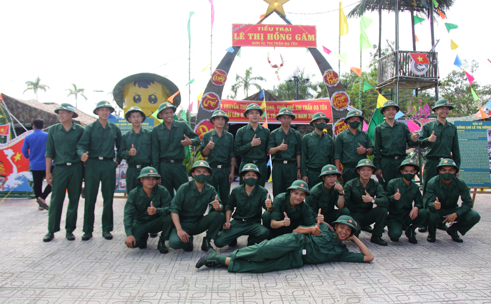 Thanh niên nhập ngũ chụp hình lưu niệm tại trại.