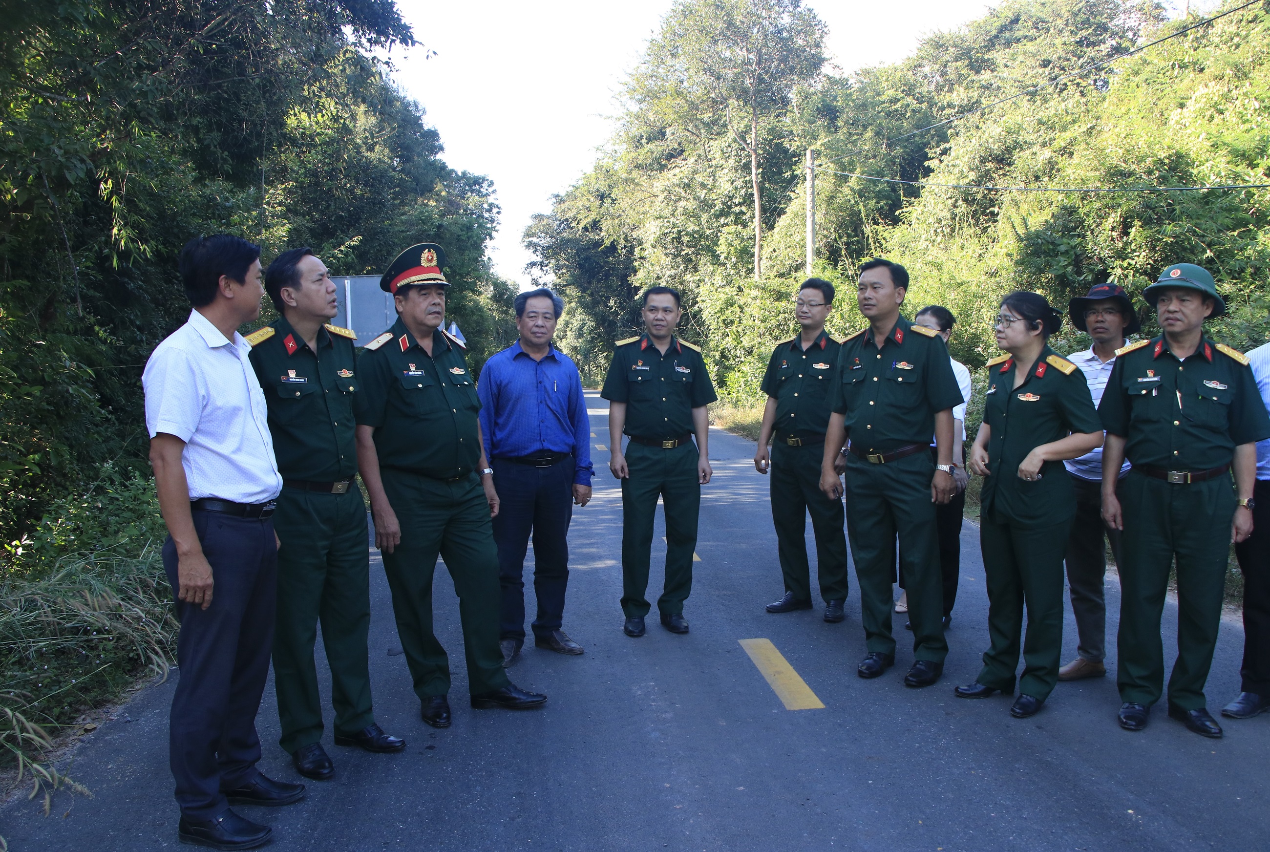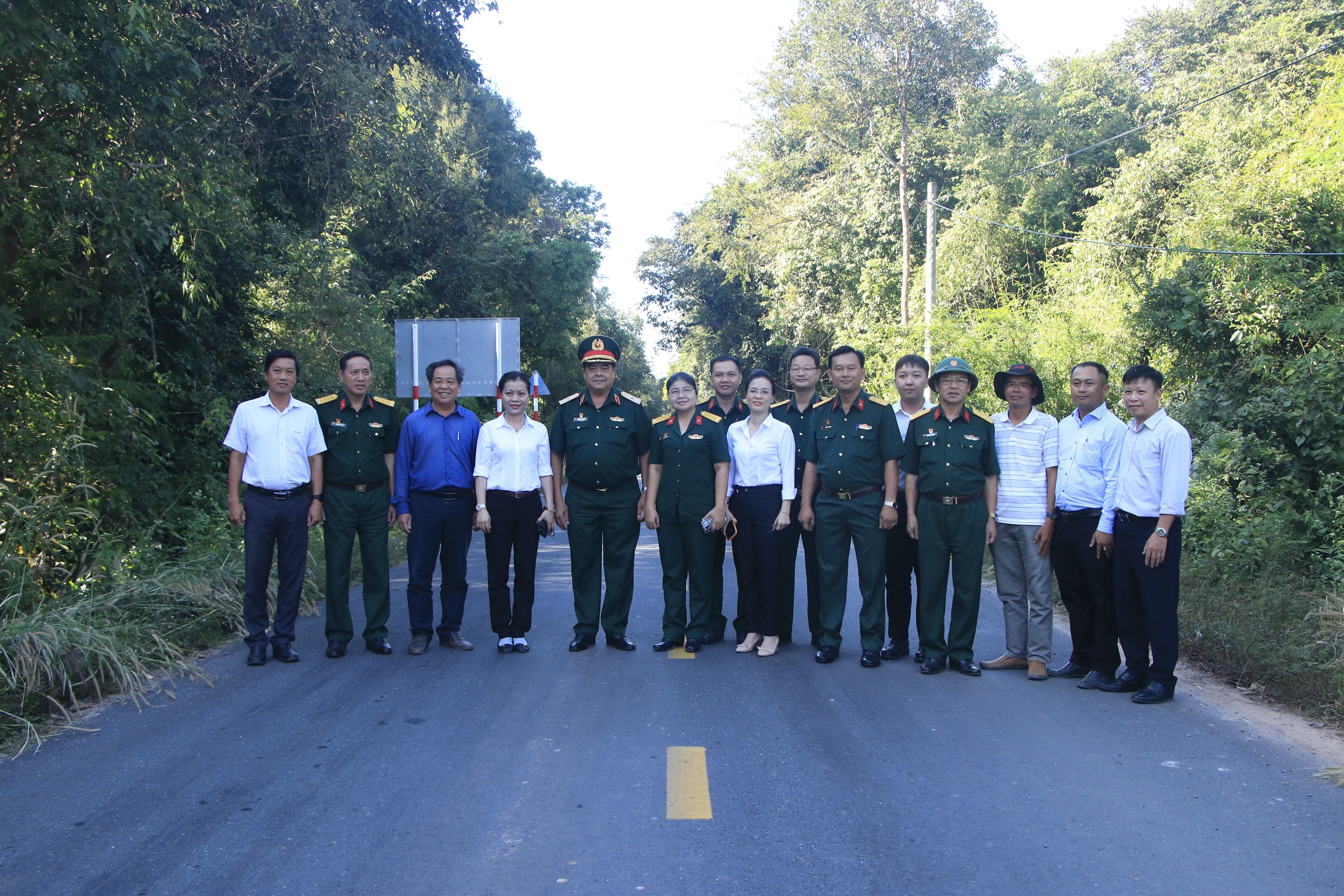 Đại biểu chụp hình lưu niệm trên tuyến đường tuần tra biên giới thuộc ấp Cây Cầy, xã Tân Hòa, huyện Tân Châu, tỉnh Tây Ninh.