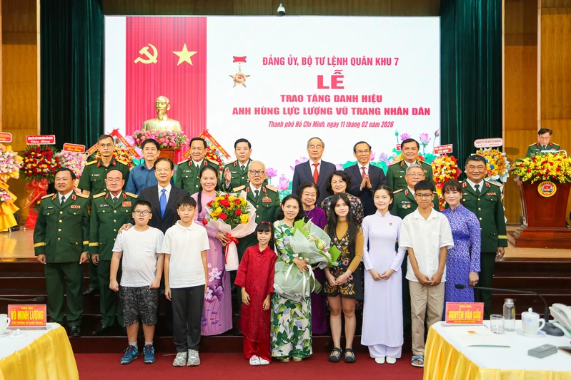 Trung tướng Lê Thành Tâm, nguyên Phó Tư lệnh Chính trị Quân khu 7 (thứ 4 từ trái qua) đón nhận danh hiệu Anh hùng LLVTND vào tháng 2/2026.