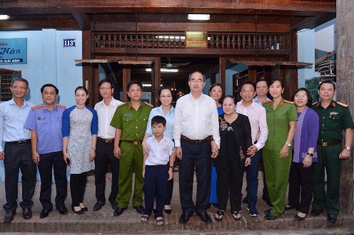 Anh Trần Vũ Bình (thứ hai từ bên trái) và gia đình đón đồng chí Nguyễn Thiện Nhân - Ủy viên Bộ Chính trị, Bí thư Thành ủy TP.HCM đến thăm di tích “Hộp thư bí mật và hầm nổi của Biệt động Sài Gòn” tại số 113A Đặng Dung