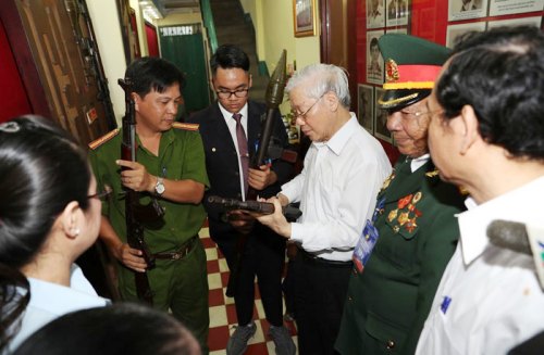 Tổng Bí thư Nguyễn Phú Trọng thăm căn hầm chứa vũ khí tại di tích 287/70 Nguyễn Đình Chiểu, nhân dịp kỷ niệm 50 cuộc Tổng tiến công và nổi dậy xuân Mậu Thân 1968