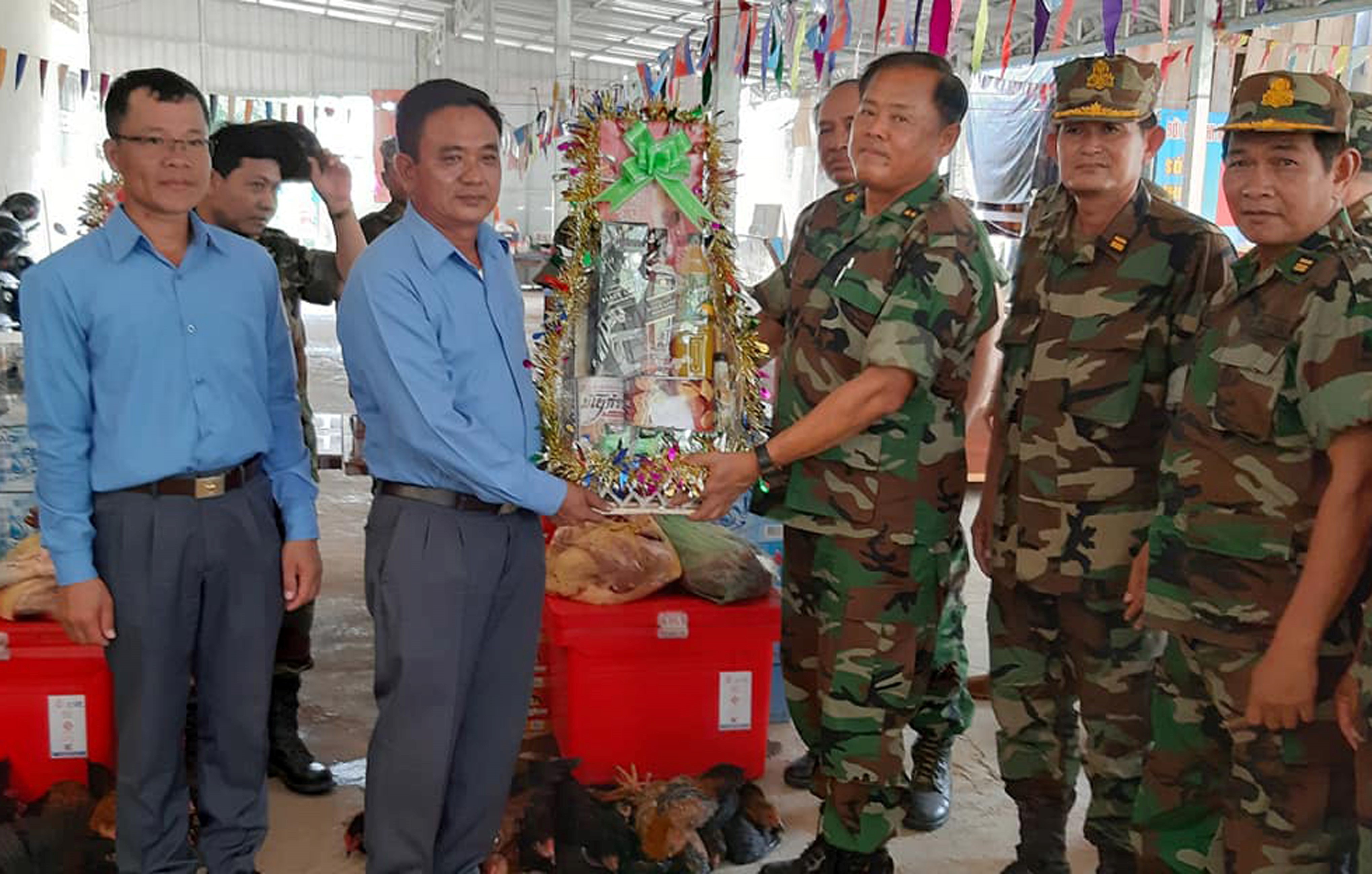 Thượng tá Trần Chí Công tặng quà đơn vị Quân đội Hoàng gia Campuchia nhân dịp Tết cổ truyền. Ảnh: CTV
