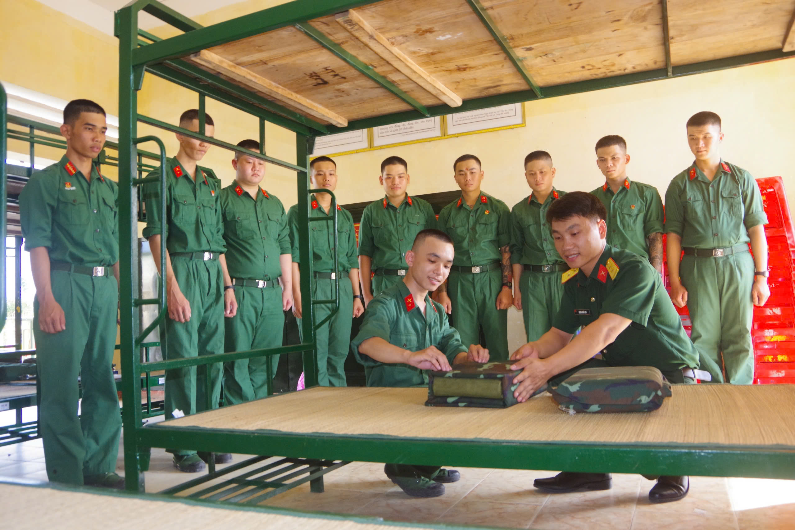 Cán bộ Trung đội hướng dẫn chiến sĩ mới gấp, xếp nội vụ.