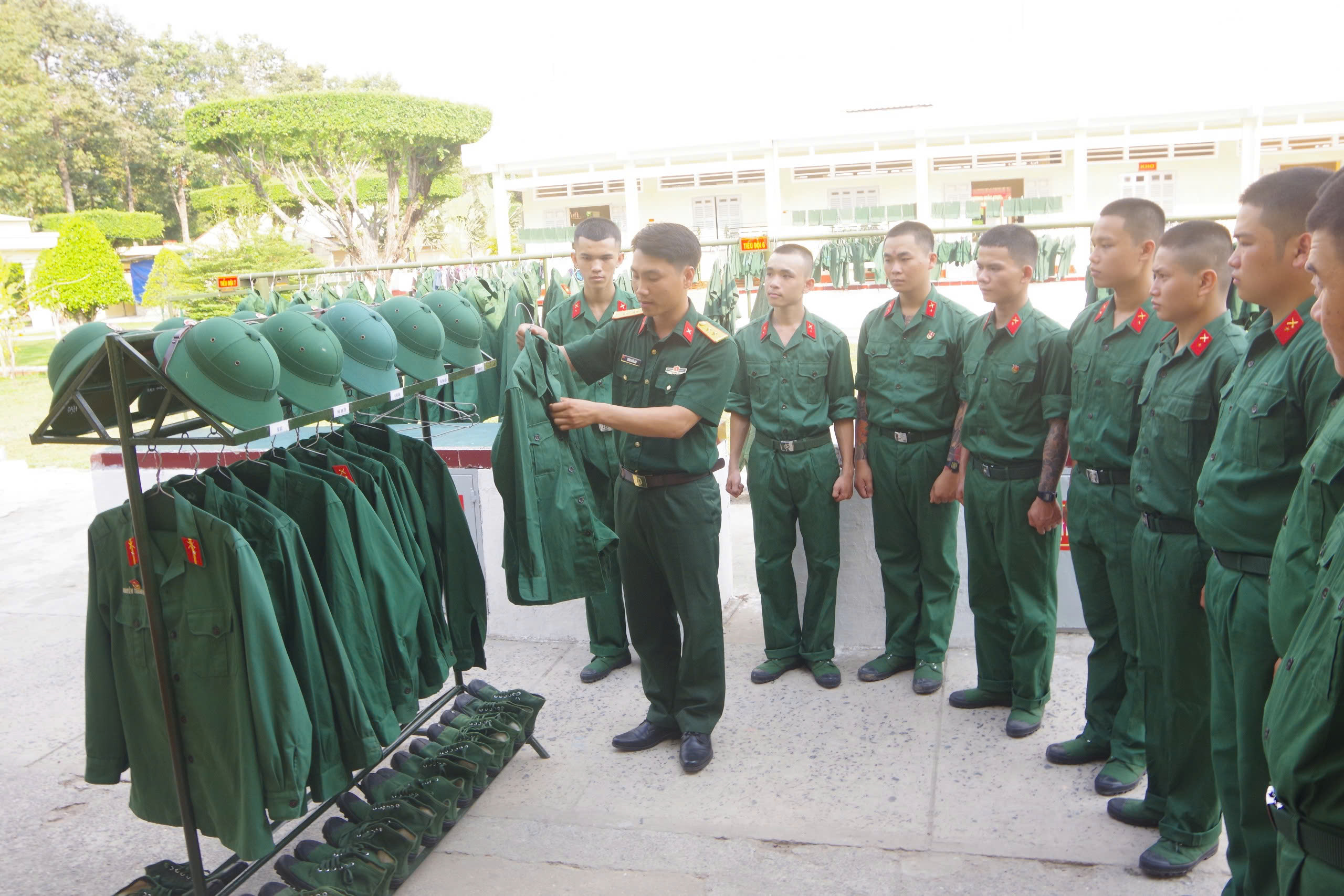 Cán bộ hướng dẫn chiến sĩ sắp xếp nội vụ vệ sinh.