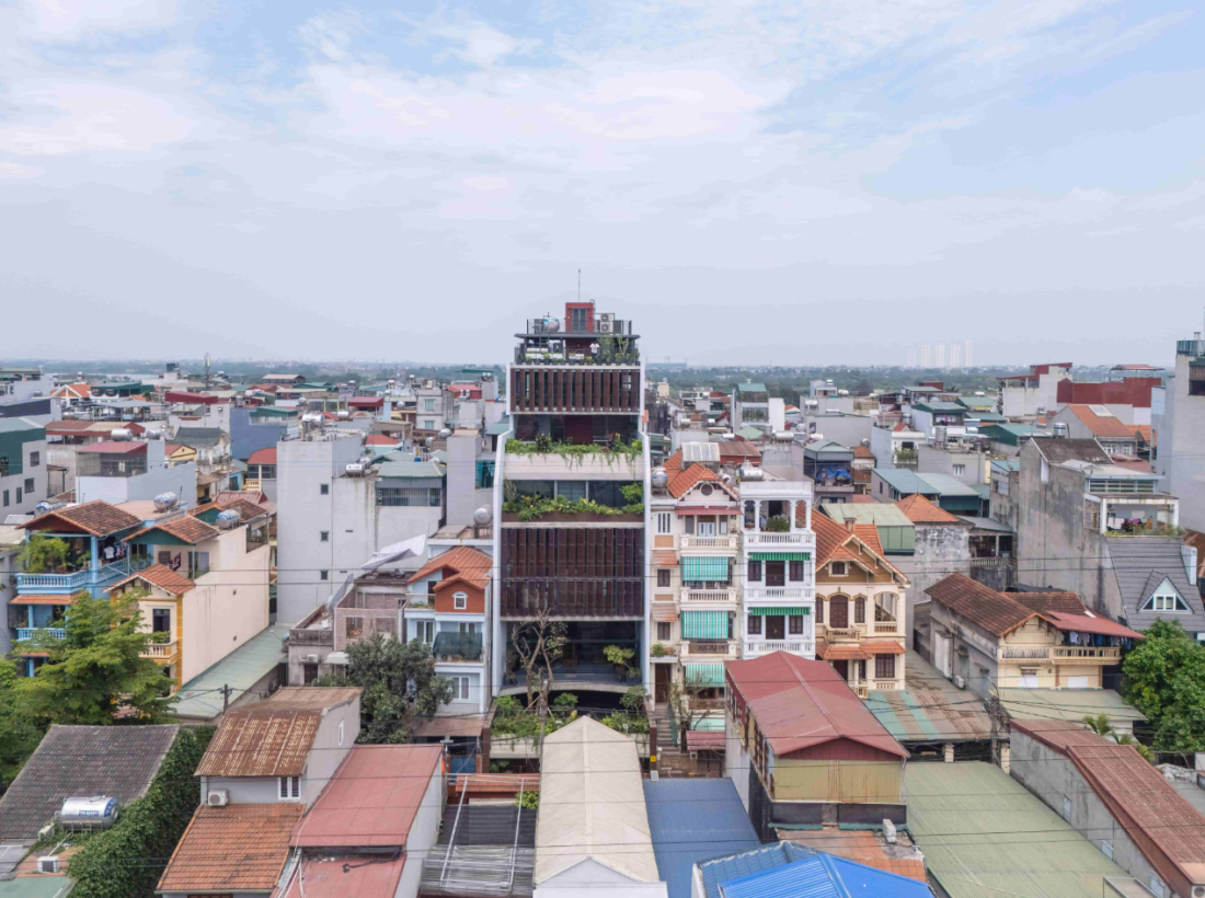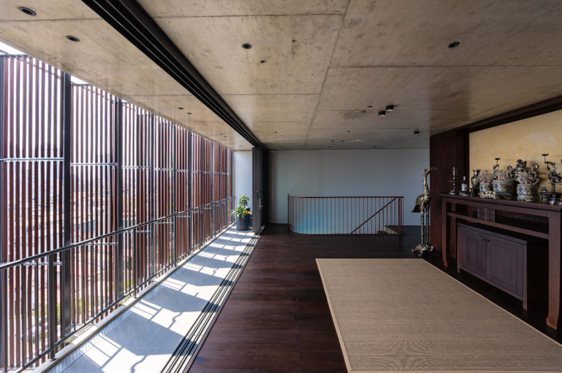 Tầng 7: Không gian thờ cúng của gia đình, được đặt ở vị trí trang trọng nhất phía trước, với màn chắn gỗ có thể điều chỉnh và cửa kính, cân bằng giữa sự trang nghiêm và sự hòa hợp với tổng thể kiến trúc. Phía trên cùng là vườn rau nhỏ và khu vực kỹ thuật, mở ra tầm nhìn bao quát thành phố.