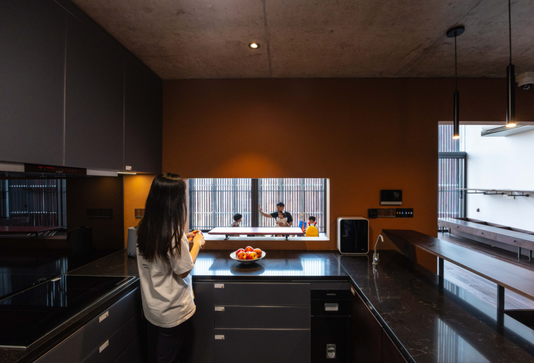 Khu vực bếp rộng rãi có lối vào được phân định với khu vực sinh hoạt chung bằng cách thiết kế như ngôi nhà nhỏ có cửa ra vào riêng và cửa sổ.