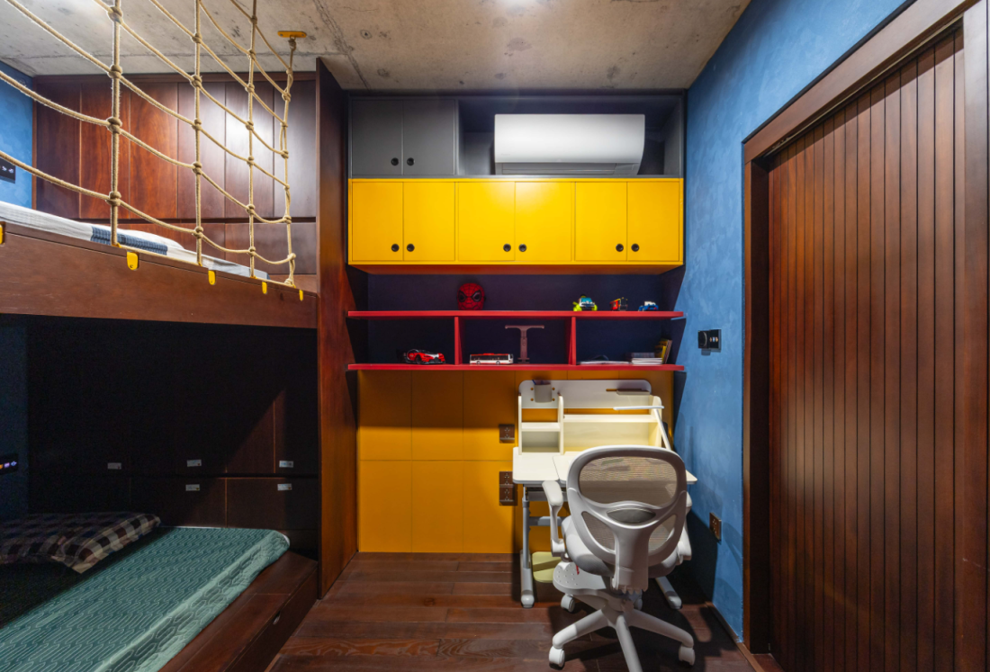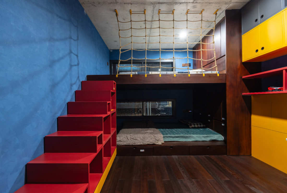 Phòng ngủ của con như thế giới thiếu nhi năng động. Bên cạnh nội thất hiện đại tích hợp công năng, màu sắc cũng trở thành ngôn ngữ kể chuyện: màu đỏ, vàng, xanh mang tính năng động, luôn tràn đầy năng lượng.