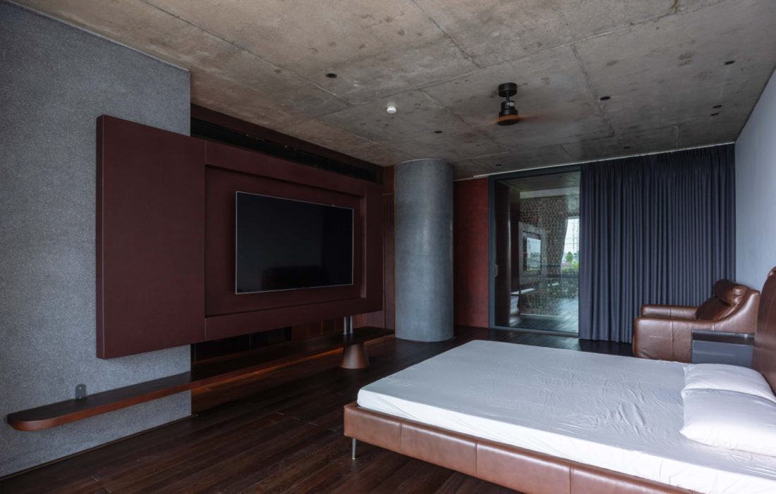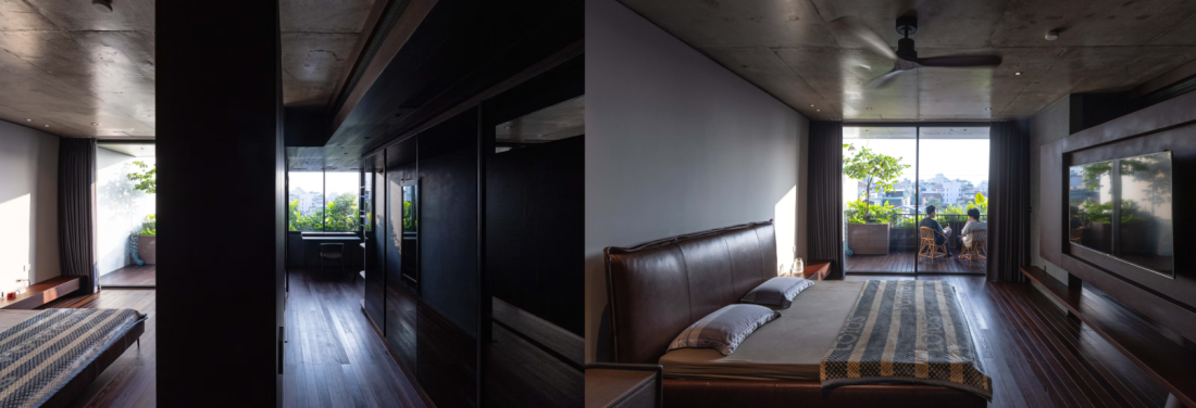 Tầng 5: Phòng ngủ chính của gia chủ, tận dụng cả tầm nhìn ra mặt tiền phía trước và giếng trời trung tâm, tạo ra một không gian nghỉ ngơi yên tĩnh và thoải mái.