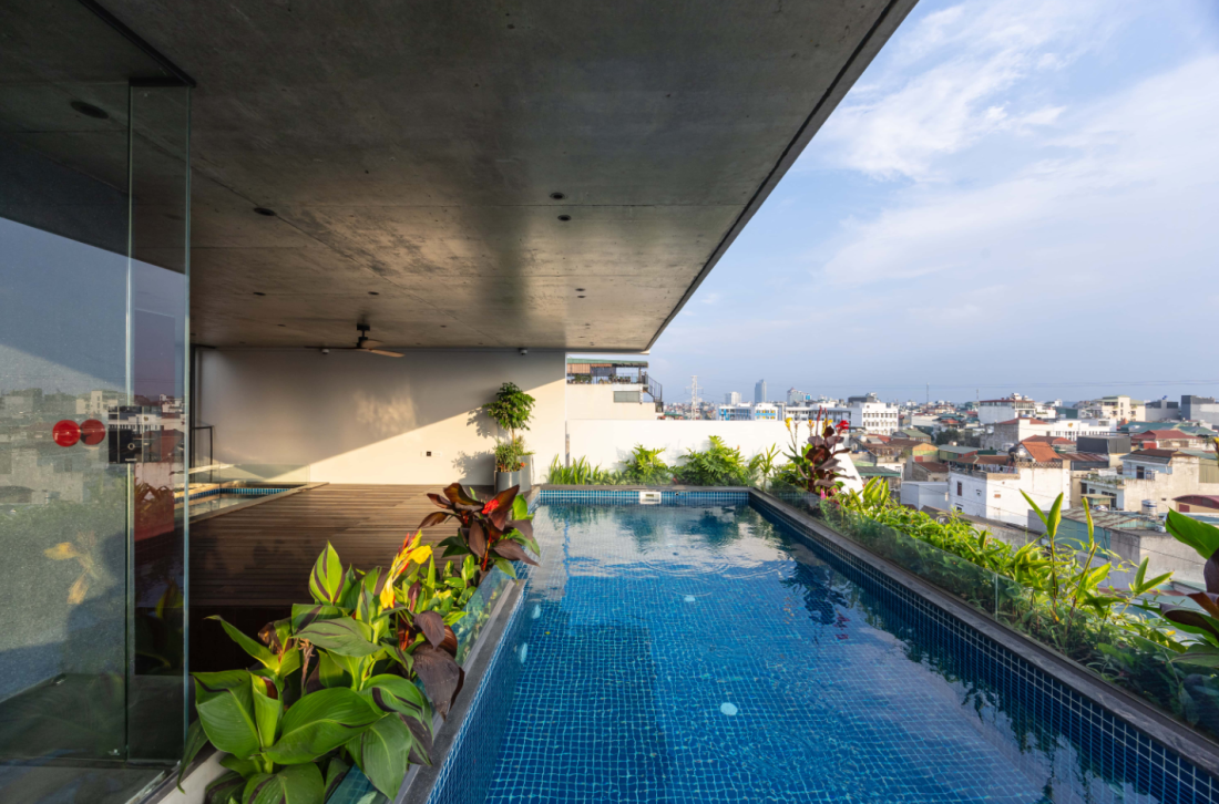 Tầng 6: Được thiết kế như một khu vực sinh hoạt chung mở với sàn gỗ ngoài trời và một hồ bơi lớn được bao quanh bởi cây xanh để đảm bảo sự riêng tư. Kèm theo đó là một hồ bơi nông nhỏ dành cho trẻ em, biến nơi đây thành ốc đảo giải trí trên cao.