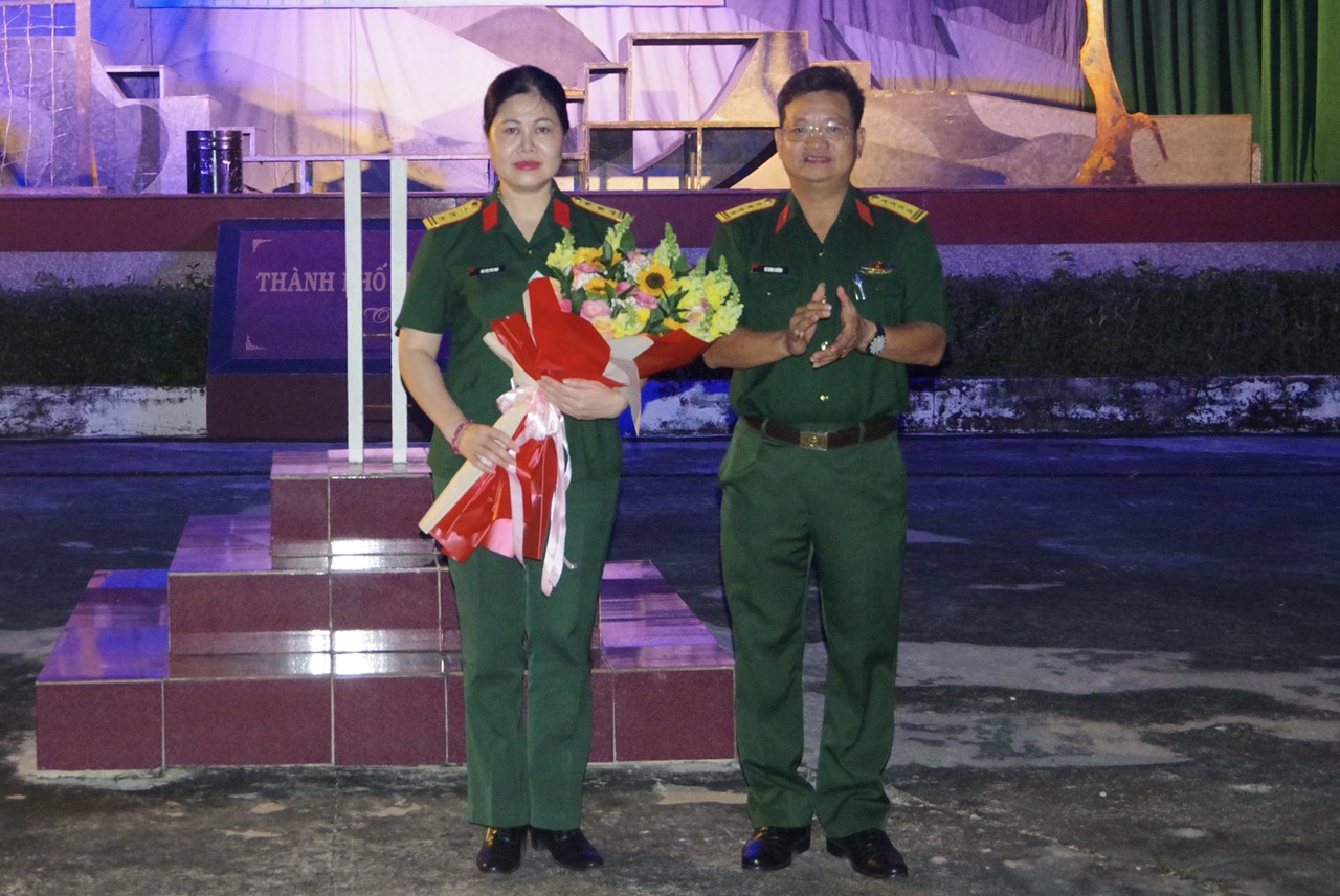 Đại tá Vũ Đình Cường - Phó Sư đoàn trưởng Sư đoàn 5 tặng hoa chúc mừng Thượng tá Ma Thị Thu Ngà - Trưởng Đoàn kịch nói Quân đội 2 đã chỉ đạo hoàn thành tốt buổi buổi diễn.