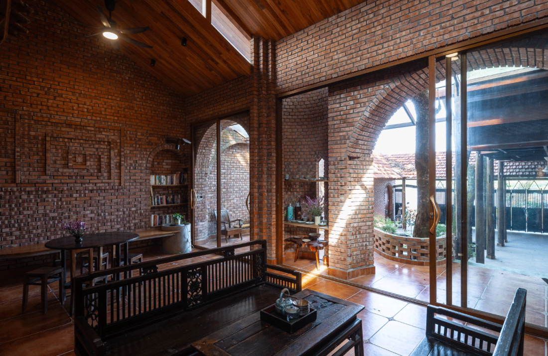 Gạch mộc tự nhiên: Toàn bộ không gian được xây dựng bằng gạch để mộc, tạo nên sự trầm mặc, mang nét hoài cổ. Nội thất sử dụng màu trầm và ưu tiên gỗ cũ từ những ngôi nhà xưa, các vật dụng được tái sử dụng hoàn toàn, vẫn còn giữ những nét đẹp của thời gian, tạo nên sự gần gũi và ấm cúng.