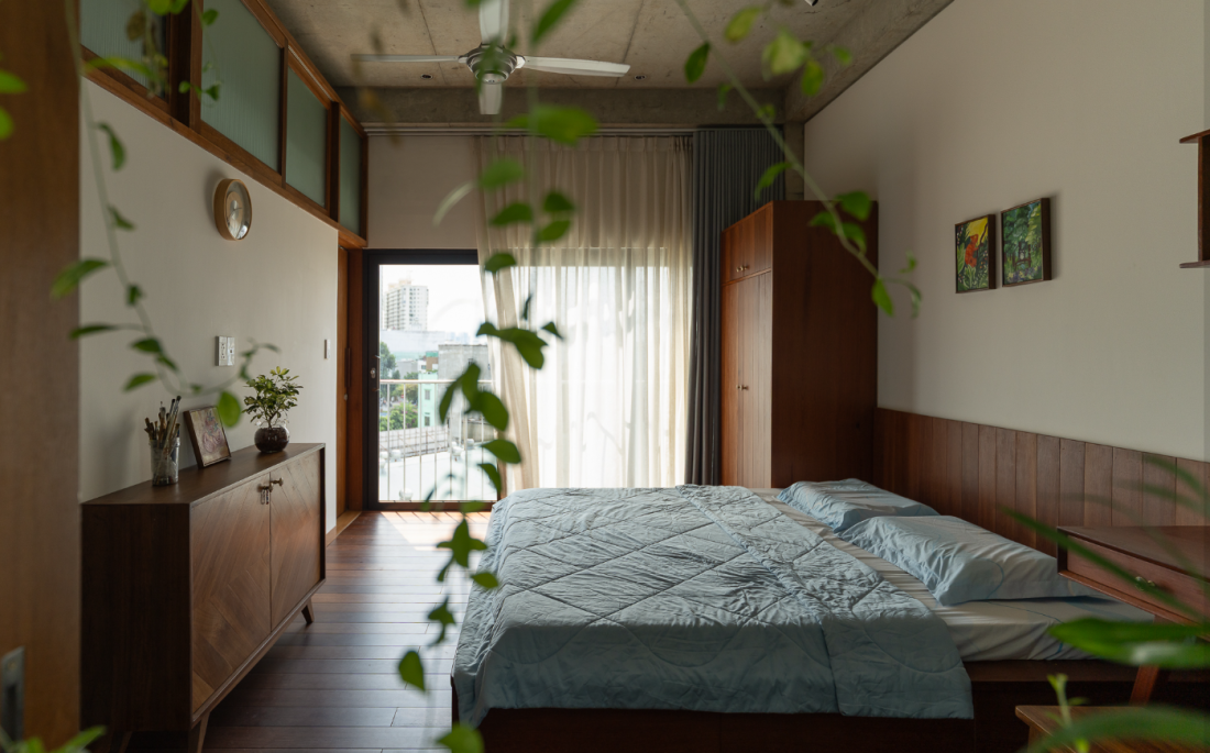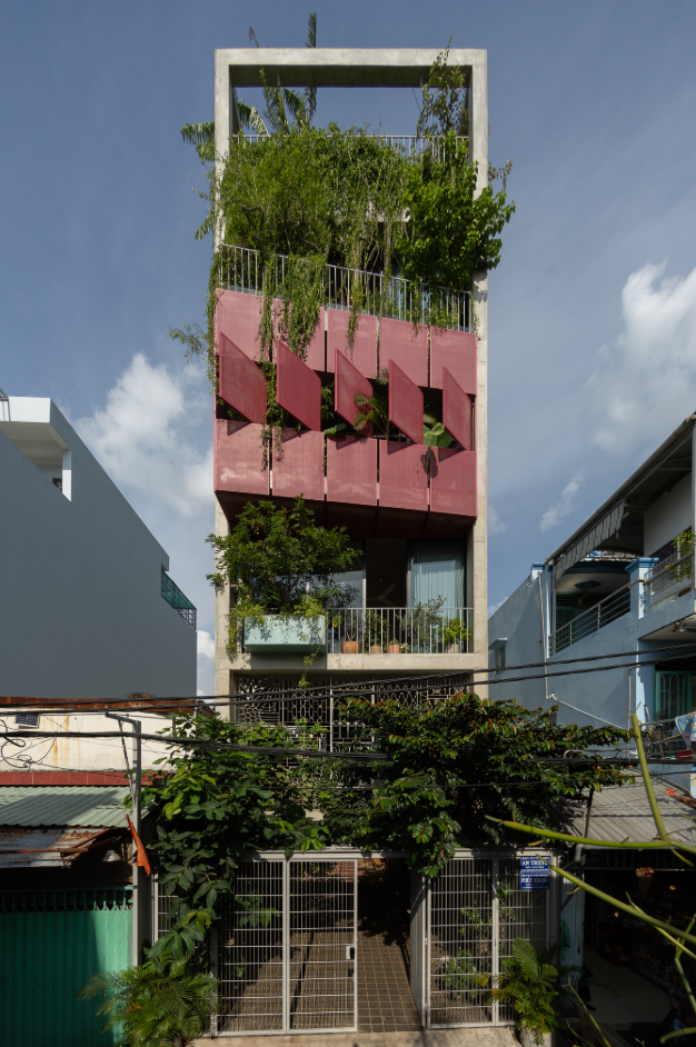 Giữa con hẻm nhỏ ngôi nhà xuất hiện như một tuyên ngôn trở về với sự thô mộc, nguyên bản. Không che giấu, ngôi nhà này phô bày khung bê tông trần, tường không trát, và sàn xi măng đánh bóng. Bí quyết nào đã giúp ngôi nhà này chống chọi với nắng phía Tây, thanh lọc không khí, và biến một con hẻm ồn ào thành một tổ ấm thư giãn, nơi cầu thang trở thành lá phổi để cả nhà hít thở?